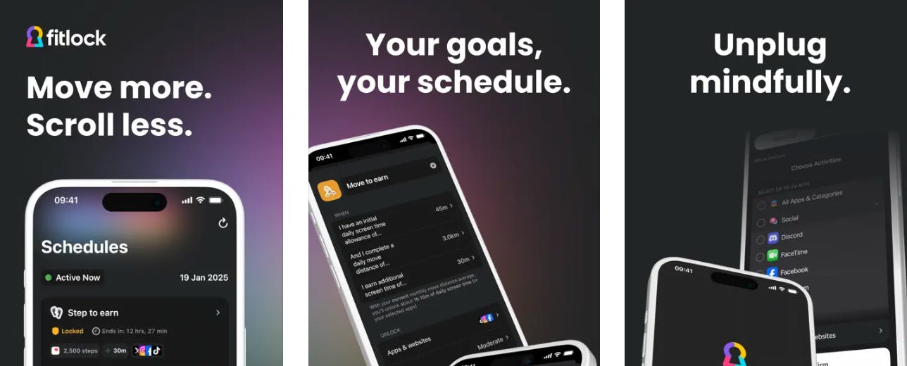 No workout? No scrolling. By tracking activities like steps, meditation, and outdoor time, Fitlock ensures you earn your screen time. It’s kind of like having a personal trainer who controls your app access, keeping you active and focused.