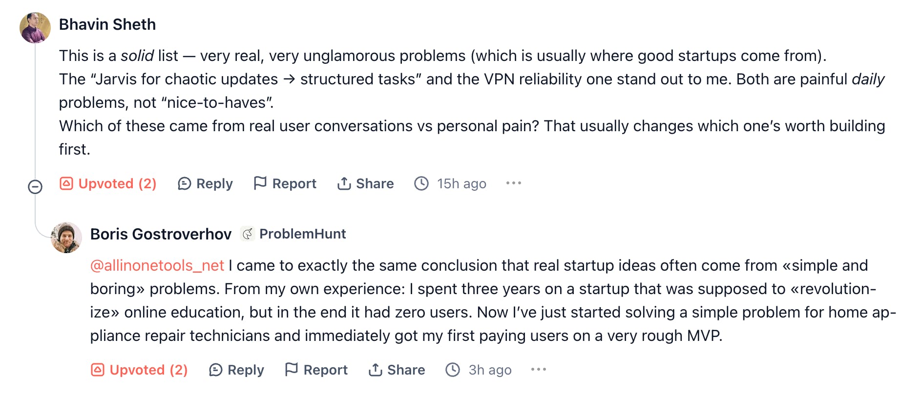 I came to exactly the same conclusion that real startup ideas often come from simple and boring problems. From my own experience: I spent three years on a startup that was supposed to revolutionize online education, but in the end it had 0 users. Now I ve just started solving a simple problem for home appliance repair technicians and immediately got my first paying users on a very rough MVP.