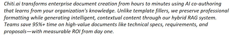 Chiti.ai transforms enterprise document creation from hours to minutes using AI co-authoring that learns from your organization's knowledge. Unlike template fillers, we preserve professional formatting while generating intelligent, contextual content through our hybrid RAG system. Teams save 95%+ time on high-value documents like technical specs, requirements, and proposals—with measurable ROI from day one.at turns ideas into professional specifications.