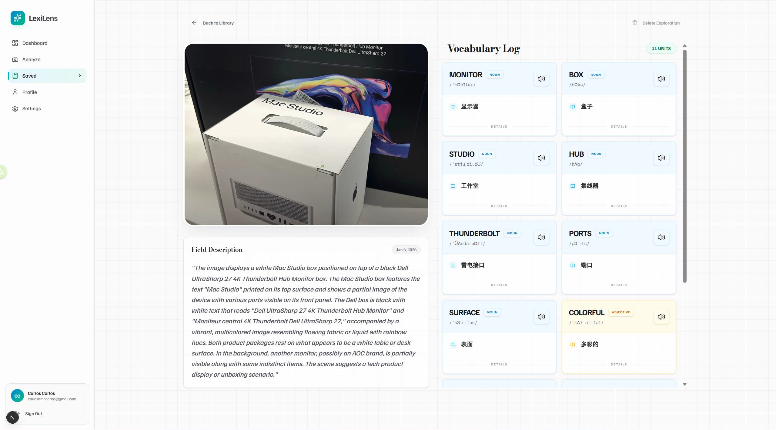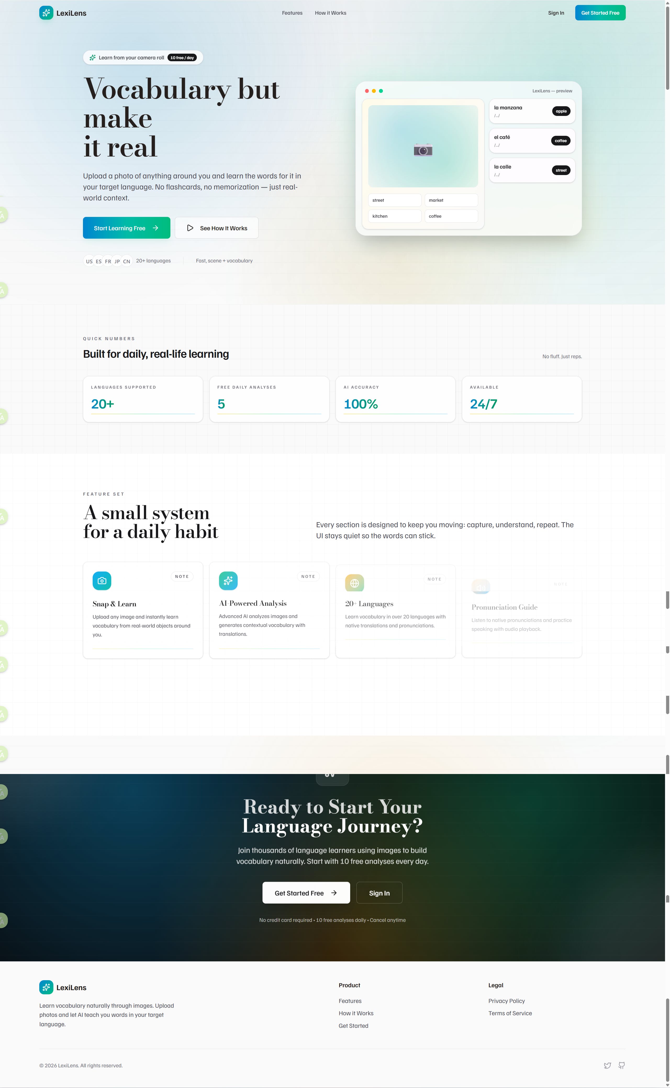 A web-based language learning platform that uses AI to analyze user-uploaded images, describe them in the target language, and extract daily object vocabulary for language learners.