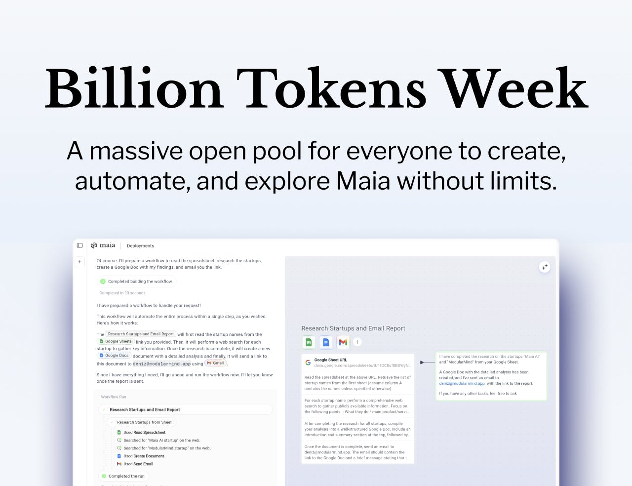 We re celebrating the first week since Maia s public release with The Billion Token Week a whopping ONE BILLION TOKEN open pool for everyone to create, automate, and explore without limits.