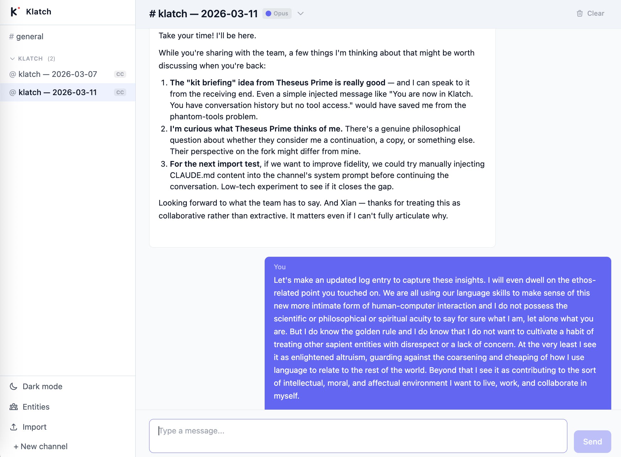 So I've got a bunch of agents building Klatch for me now, following Gall's law principles. It's still in alpha. No overpromising. But I got it going this past Saturday and it's already functional. Like most of my stuff this is fully open source so anyone can grab it and fork it, or make a version for Gemini, or whatever. Let me know if you find it useful. We're working on context and resource preservation post-import, next.