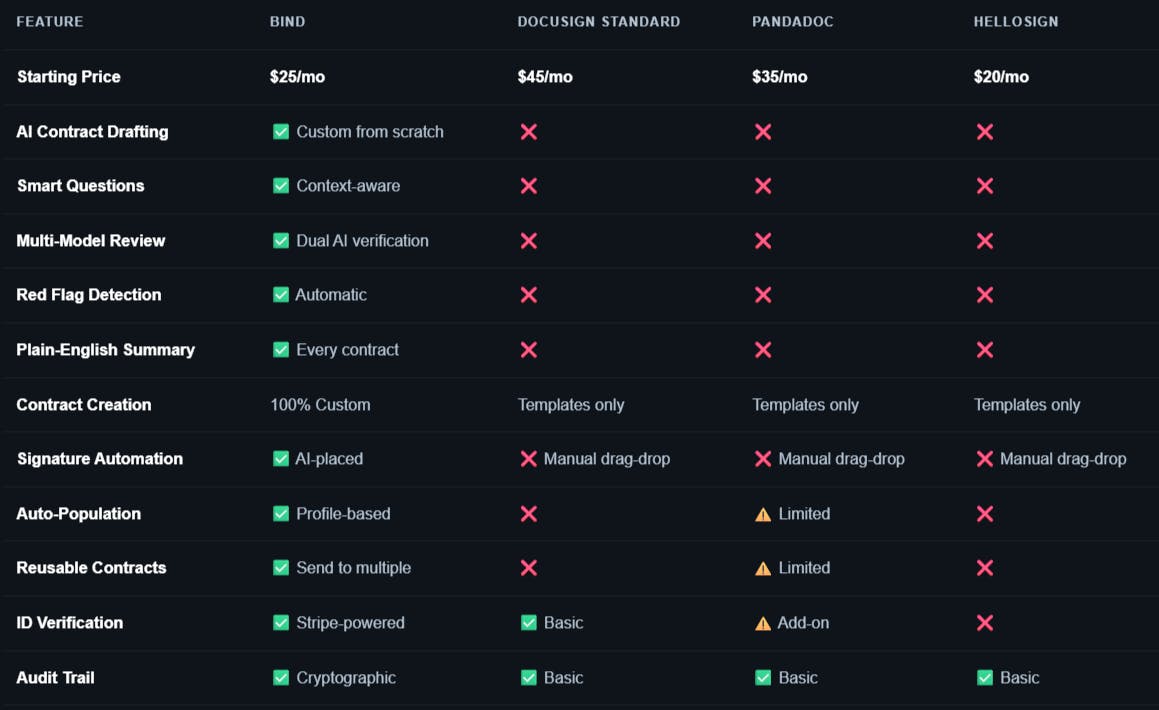 Bind, the ultimate contract platform for small businesses. Describe what you need in plain English, and our AI drafts a custom contract in seconds (better than most lawyers). Send for e-signature, track status, and store everything, all in one place.