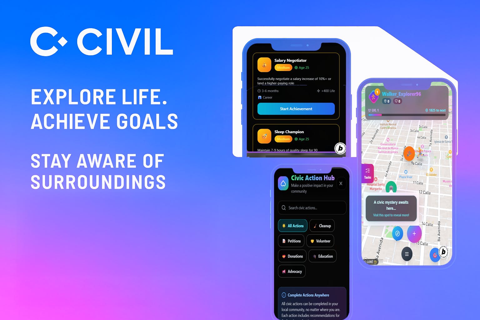 Navigating life in certain countries can feel like wandering through the complex, demanding worlds of a FromSoftware game. Without guidance, it s easy to face aimless struggles. CIVIL gamifies real-world exploration and growth with a sign system, achievements, civic actions, proximity-based unlockable activities and encrypted p2p social features. Drawing inspiration from Pok mon Go and gaming as a whole, it helps users stay aware of their surroundings, pursue goals, and thrive in challenging environments.