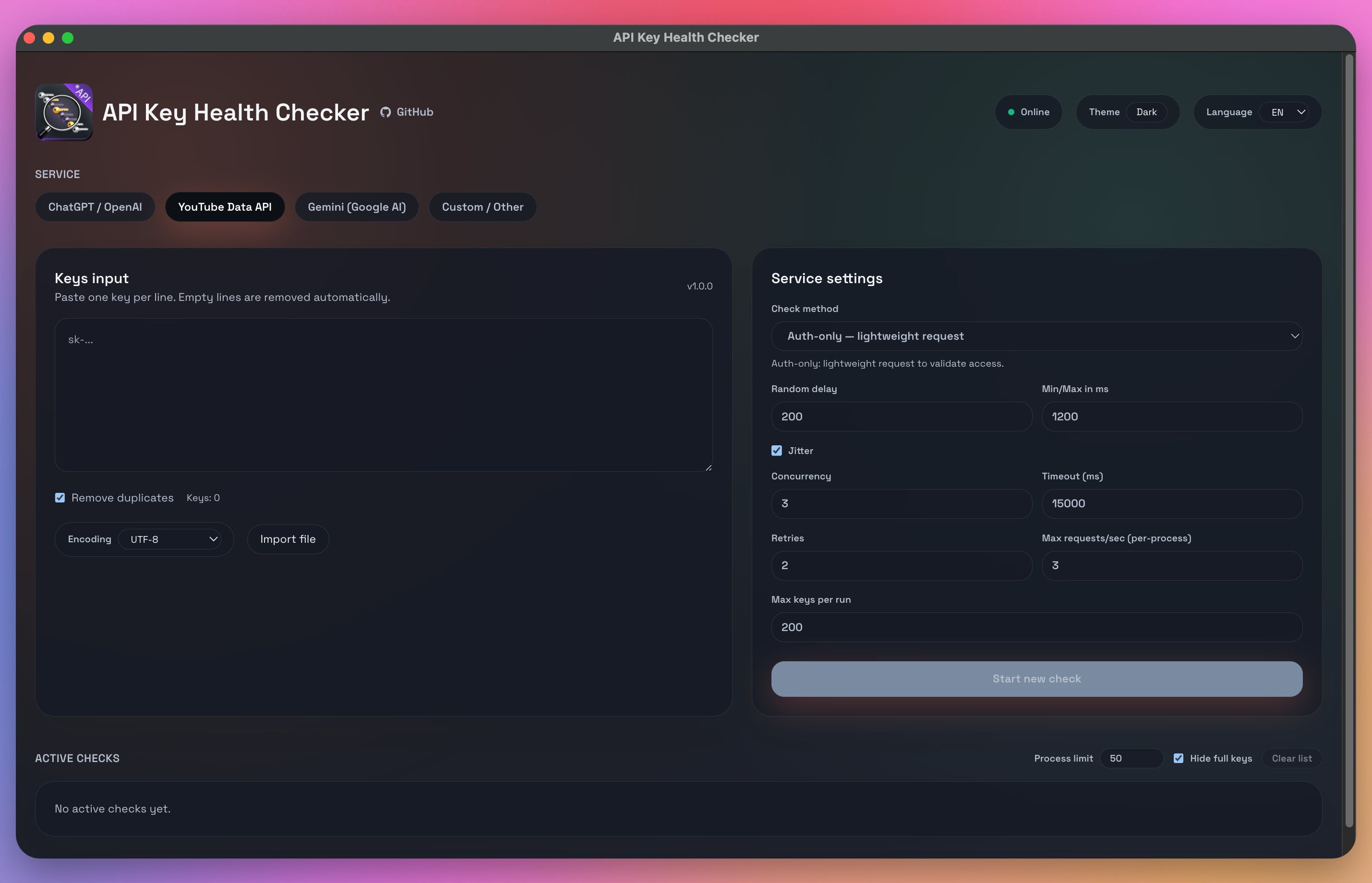Simple desktop app to validate API keys for popular services and run batch checks with rate limits and reports. Supports OpenAI (ChatGPT), Google Gemini, YouTube Data API, and custom endpoints. For MacOS, Windows, Linux.
