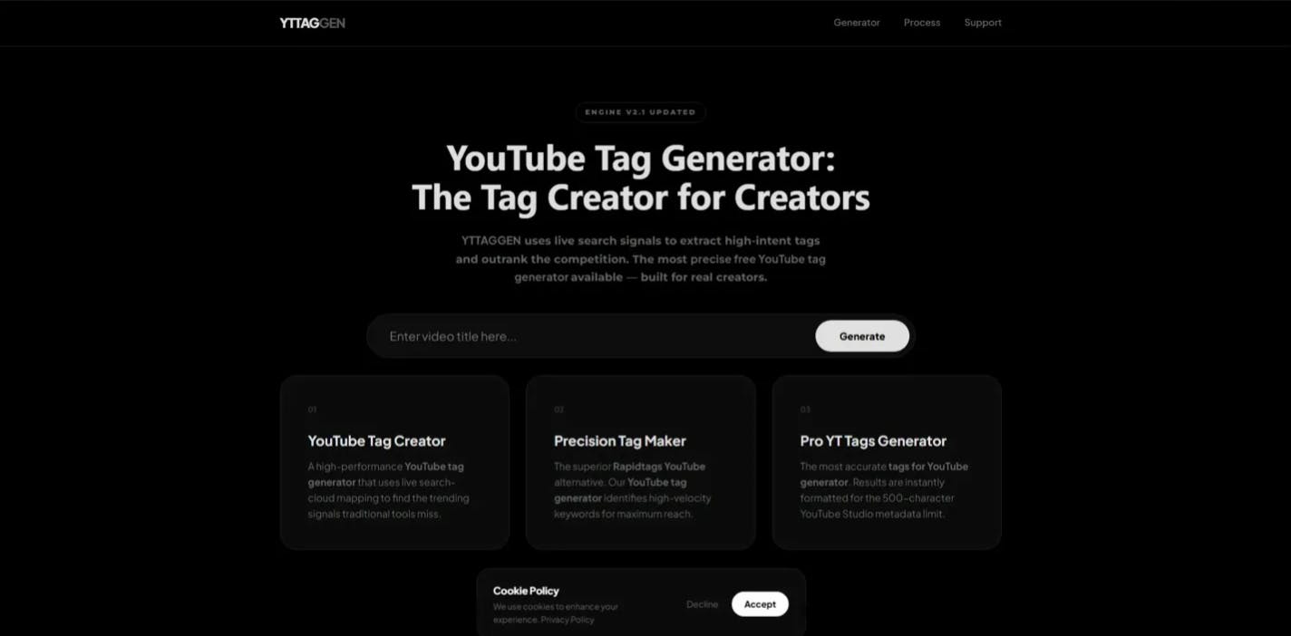 hey everyone we launched YTTAGGEN which refers to the youtube yag genrator for free no login required. our tool basically works by fetching the autocomplete suggestion and after applying filter generated tags will placed in front of user this is the most unique way to identify the trend and what people actually searching for. most of other tag generator use API's that directly fetch the tag from the videos that are already uploaded on the youtube so is how we built different and very useful tool