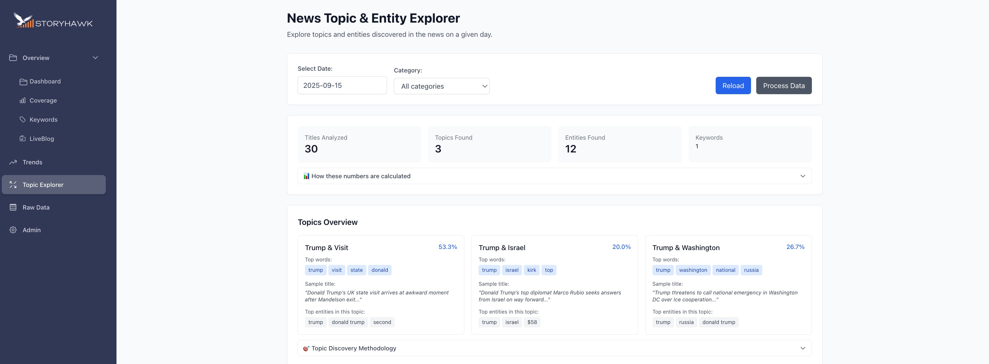 Topics Found clusters of stories grouped into clear themes.