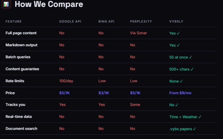 Hello fellow hunters, My name is Robert, and I have a passion for advancing AI and systems. The problem I found on my journey was that AI wasn't necessarily bad at giving responses in most cases, but rather it didn't have access to proper information. One solution was using web search API, but often times you are limited on content, have to parse messy HTML, and say a prayer that the content is relevant without any guarantee. My team and I decided enough was enough and designed Vybsly Search, an independent search engine with its own growing index. When you search you get the ACTUAL page content, no links or partial snippets, but the real text. We believe no one should have a monopoly on knowledge, especially when AI needs it most. Instead of stitching together Tavily and Exa and a weather API and then a crypto API etc etc, users can get everything in ONE call. We have spent years working on this type of project and appreciate anyone who tries it out. Best of luck to everyone perusing their dreams, as we will continue to build ours to help others achieve what was once not possible. Thanks :)