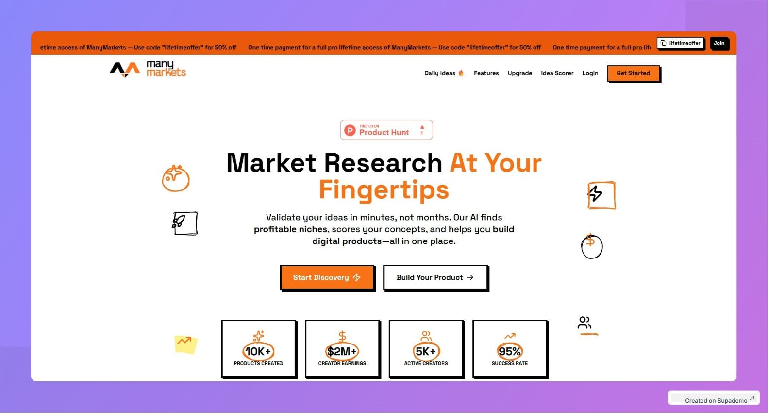 Stop wasting time on unvalidated ideas. ManyMarkets uses AI to find your profitable niche, score your product idea for market demand, and provides an all-in-one studio to build and launch your digital product in days.