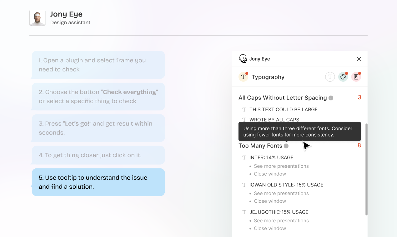 - Jony Eye scans your design files and offers actionable fixes. Plus, the product name is too good.