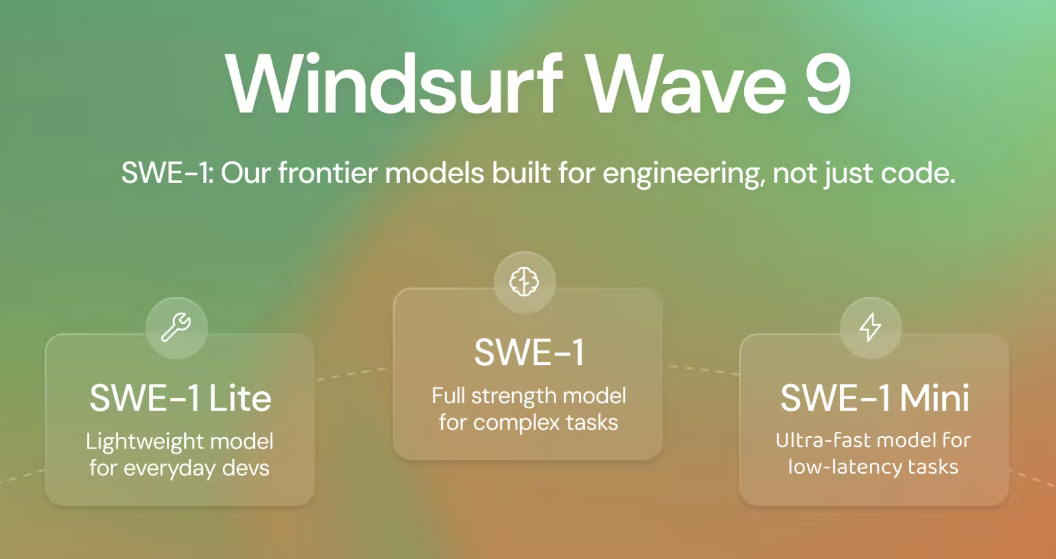 Windsurfâs Wave 9 update ships three modelsâSWE-1, SWE-1-lite, and SWE-1-miniâtrained for pure software work. Plug them into the Windsurf IDE and theyâll write reviews, generate tests, and draft design docs. Lite and mini are free if you just want to kick the tyres.
