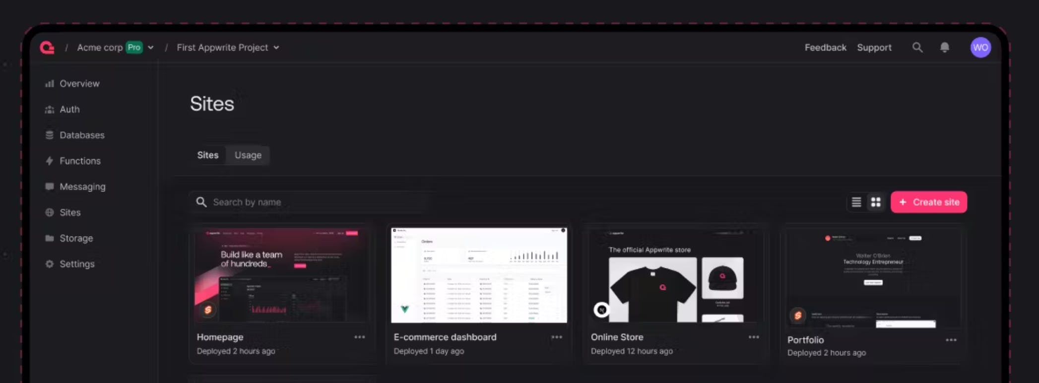 Appwrite Sites is the platformâs new hosting arm. Point it at a static or server-rendered repo, click deploy, hook up your domain, and youâre live, with SSL, previews, and templates included. Think Vercel vibes, minus the closed source.
