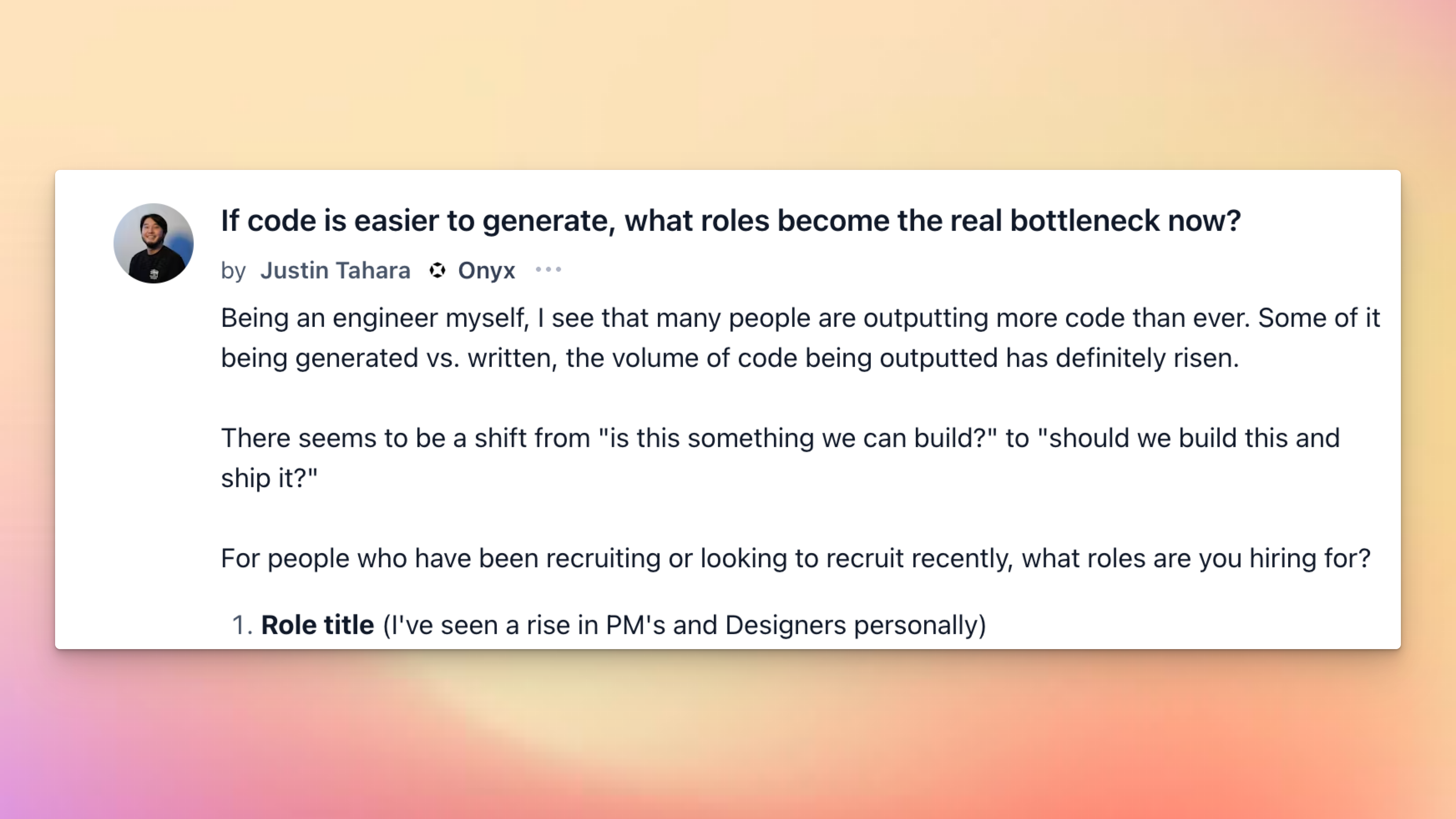 Justin Tahara asks: if code is easier to generate, what roles become the real chokepoint?