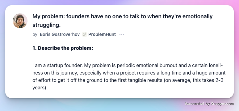 Boris Gostroverhov, founder of ProblemHunt, last month shared his story of spinning a decade of startup failures into success. Across a decade of trial and error, he launched 18 different products. What he didnât share was the loneliness and emotional burnout that would bubble up every few months.