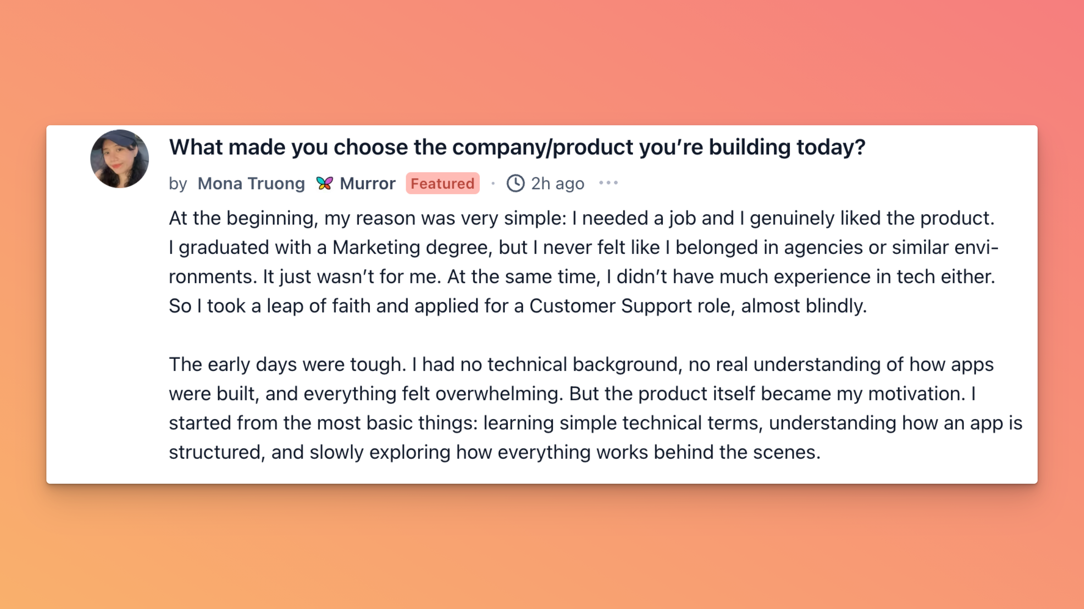 Mona Truong opened a thread explaining how she ended up building where she is now: it started as “I need a job and I like this product,” turned into a crash course in tech from a customer support seat, and eventually became something personal when the product started helping with her own mental health. That mix of survival, curiosity, and meaning is why she stayed.
