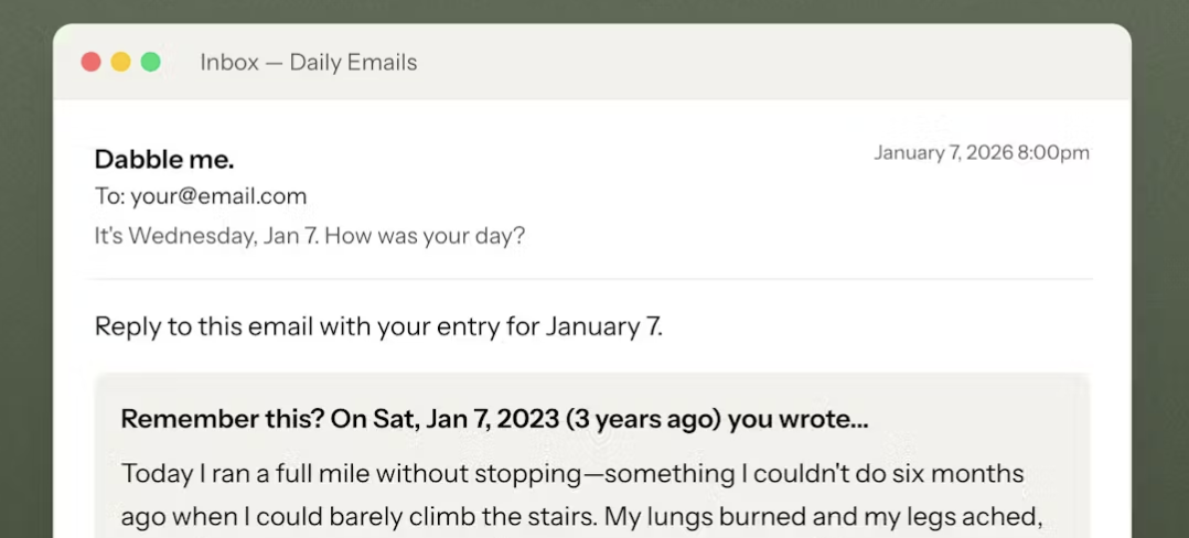 Dabble Me is private email journaling for people who will never remember to open a journaling app. It sends you a prompt, you hit reply, type whatever happened, maybe add a photo, and that email becomes your entry. Past entries pop back into your inbox over time, so you get little “on this day” flashes without scrolling a timeline or touching a feed.