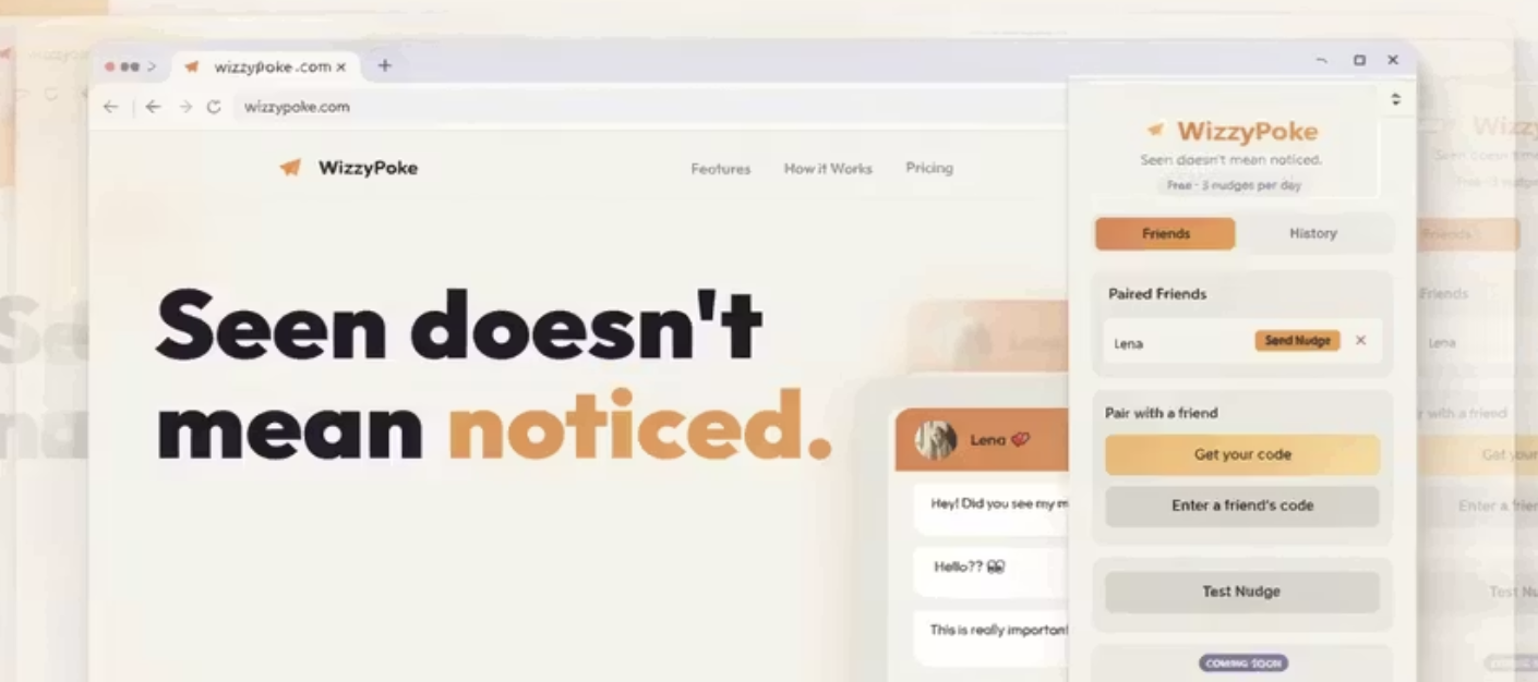 WizzyPoke is a Chrome extension that lets you send old-school screen shakes to your friends when “seen” clearly didn’t mean “noticed.” You pair with a simple 6-digit code, no phone numbers, then fire off nudges that vibrate their browser across apps like WhatsApp Web, YouTube, Netflix, and more.