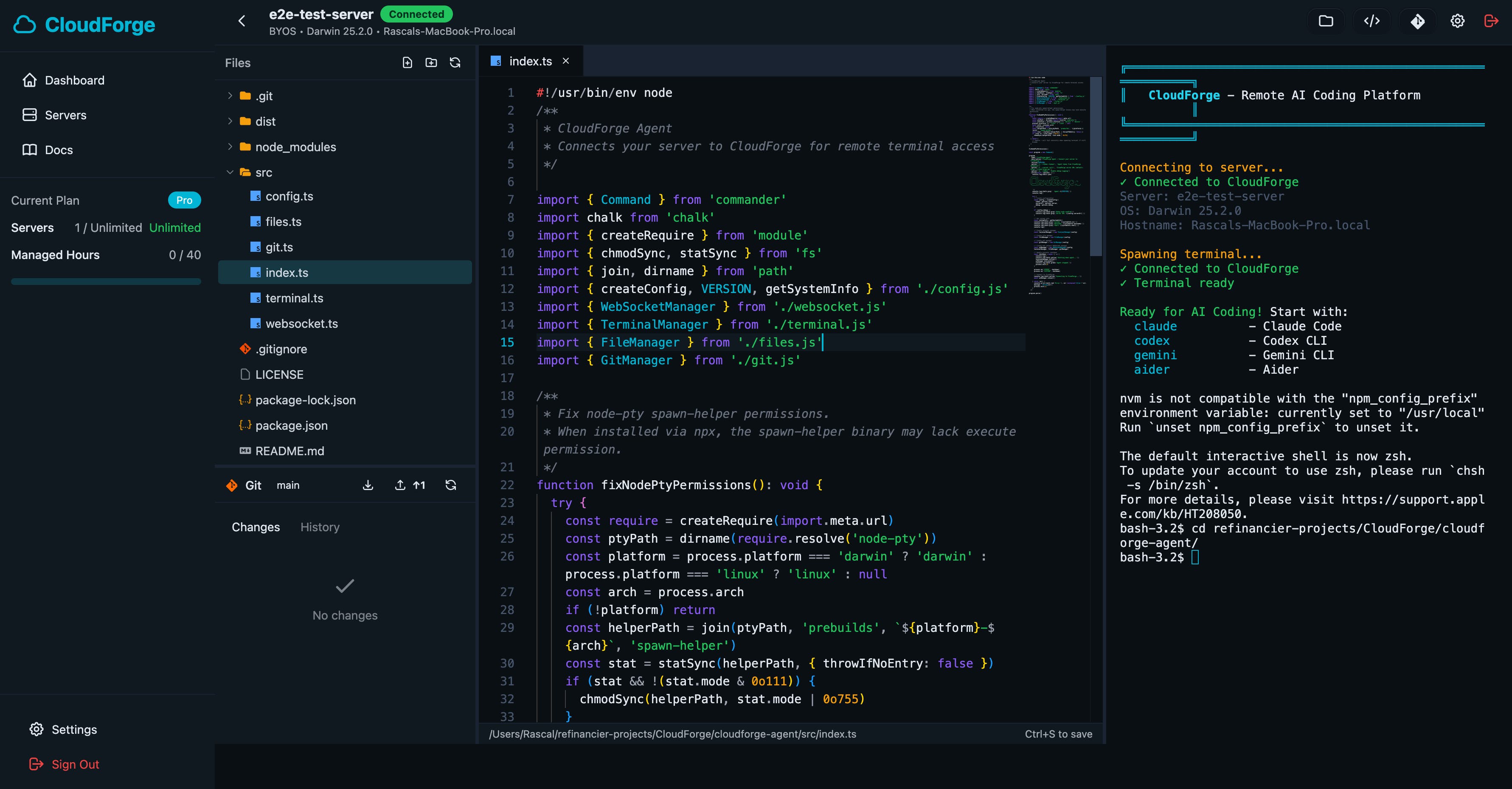 Privacy-first: your code stays on your own server (BYOS) or isolated environment — CloudForge doesn’t take your repo.