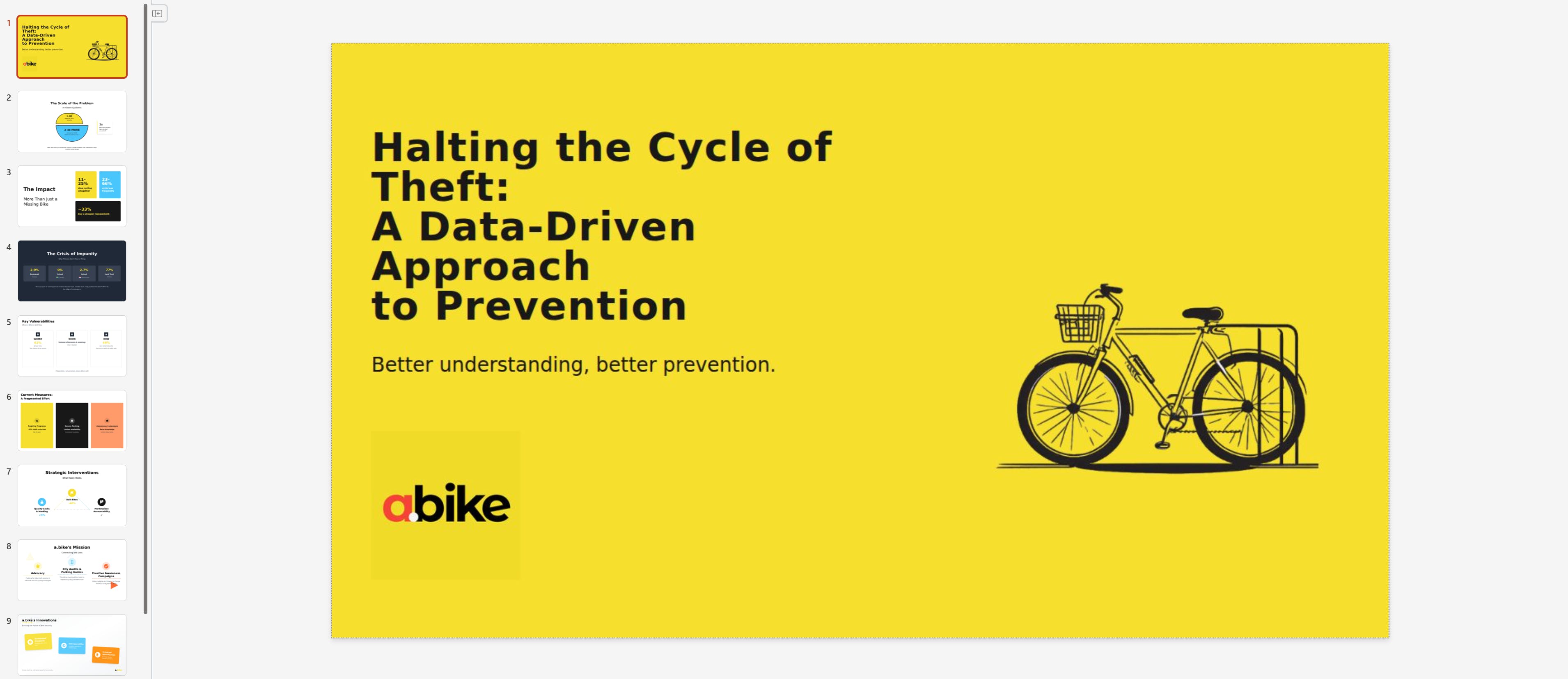 topic: minimalist 12 slide presentation on "Bike theft: the most underrated obstacle to increase cycling uptake."