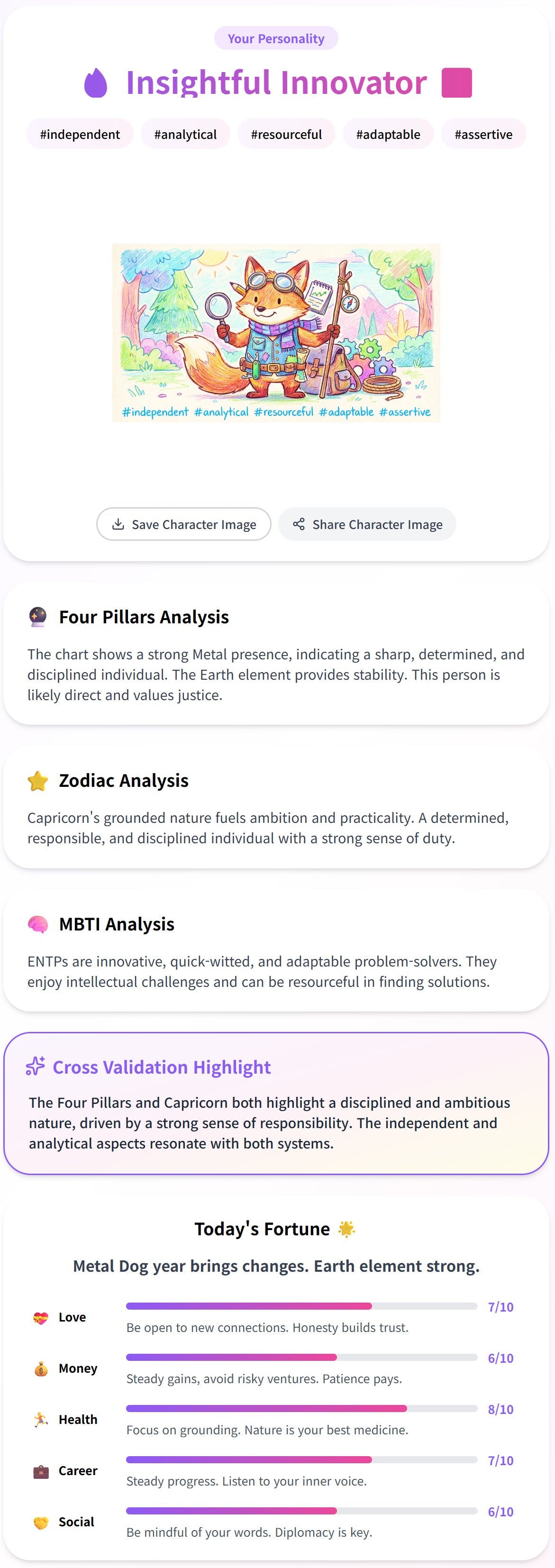 FoloLink is a free personality analysis service that uniquely combines three systems: Four Pillars of Destiny, Western Zodiac, and MBTI. Key Features: • Cross-validation across three frameworks • personalized interpretations • Daily fortune and compatibility analysis • Beautiful shareable results Perfect for self-discovery, astrology enthusiasts, and anyone curious about personality. We're building toward a dating app that matches people based on Four Pillars, Zodiac, and MBTI compatibility.