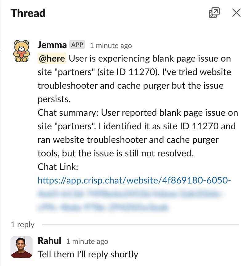 If the issue is not resolved after different troubleshooting attempts, agent sends us a message on slack. When a team member replies to that message, agent proceeds based on that.
