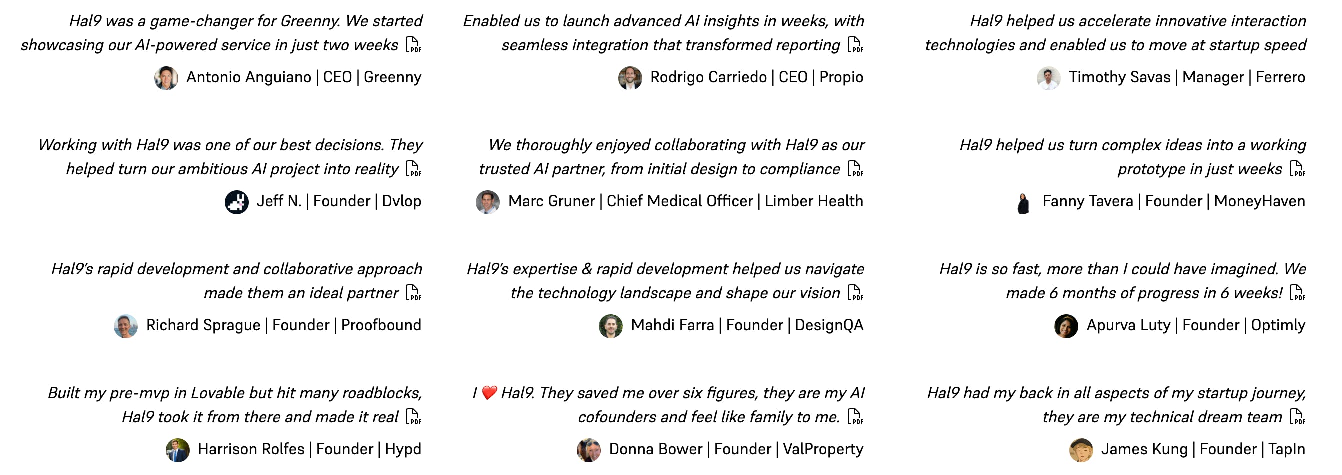 @vouchy ALL OF THEM! We have a few testimonials in our website hal9.com. For the most part, everyone hits a wall at some point and need help getting unstuck. Different founders hit a wall at different stages, some very early on and it feels like they are missing 80% of their vibe-coded product, others come at 90% and find out they can't get the tech or AI to perform closer to 100%.