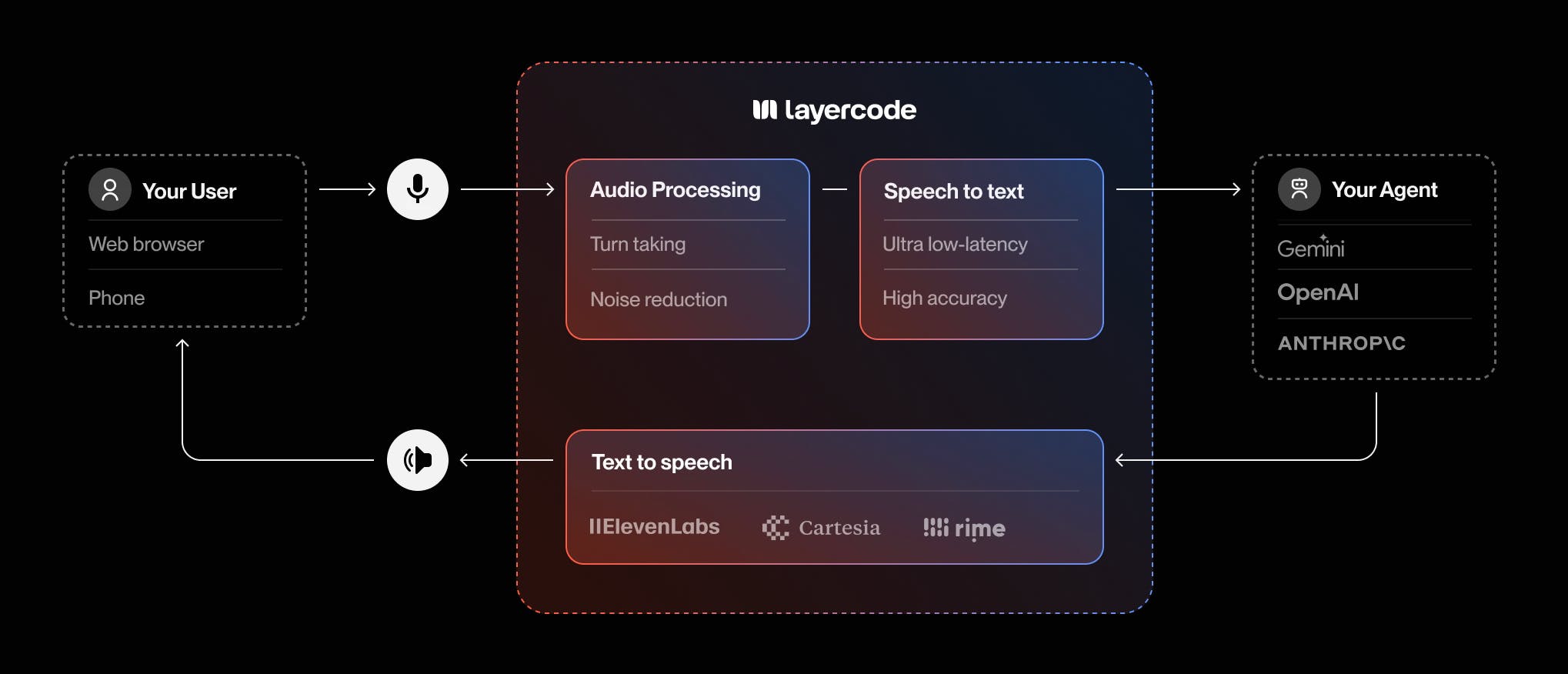 4. Synthesize: Layercode uses your chosen text-to-speech model to convert the agent’s response to natural speech.