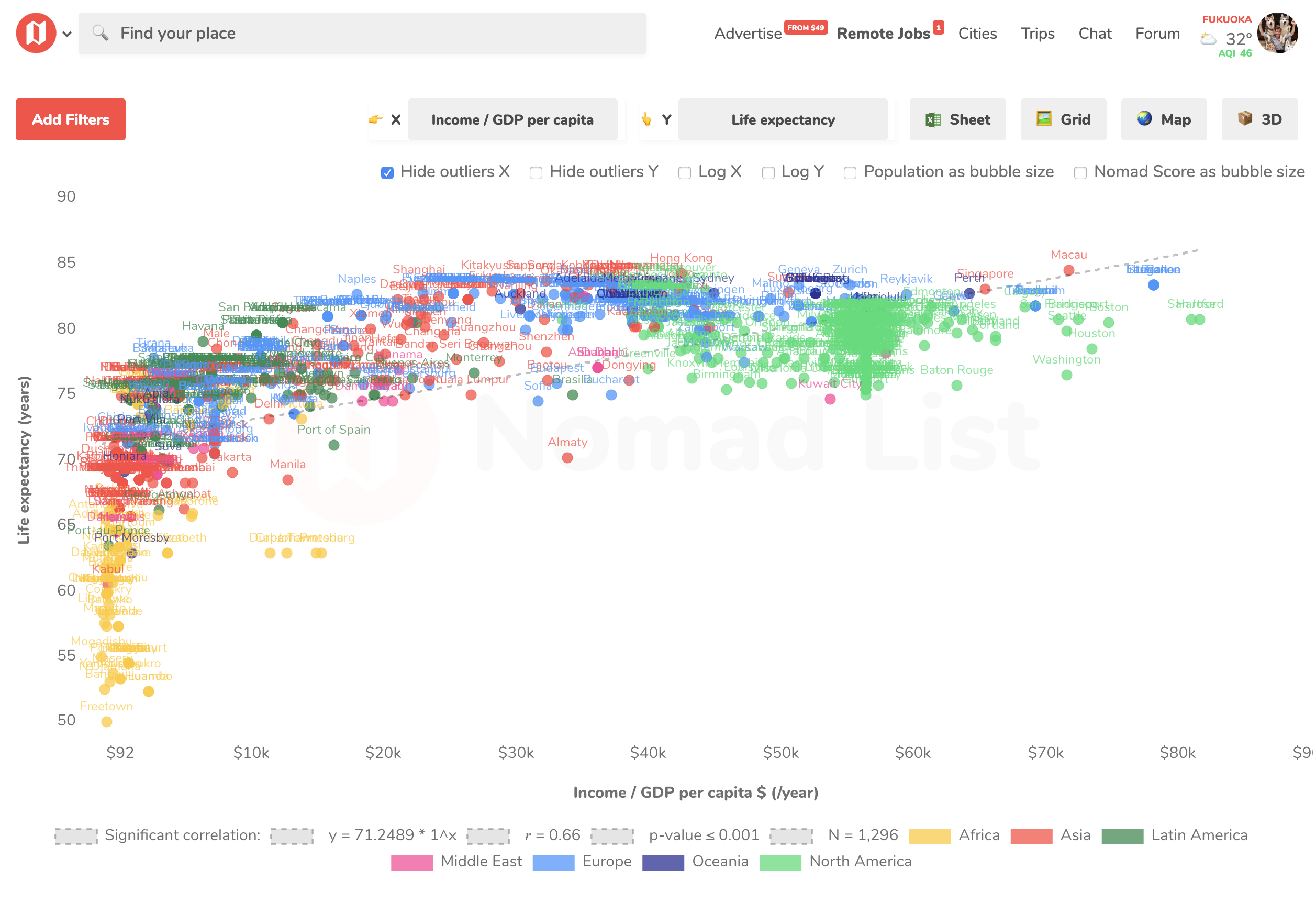 📈 Data science is really interesting to me, so I've built a mini data studio into Nomad List. If you click CHART, you can combine two data points and see the data for all cities in an X/Y graph. It also figures out if the data correlates significantly (with a p-value). And you can export any data to a spreadsheet CSV, to analyze yourself. Government agencies from South Korea, Indonesia, Spain, Ireland, Georgia and Hungary have now used Nomad List to improve their cities, so this might help. https://nomadlist.com/chart