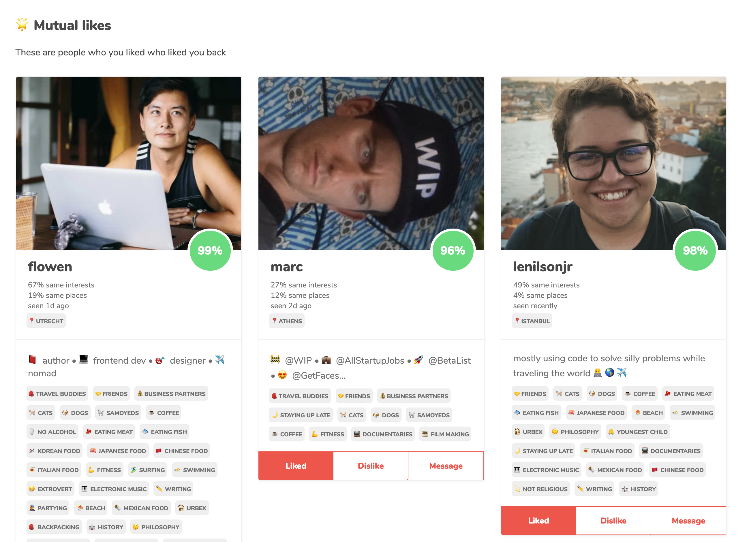 🥰A big challenge for nomads is loneliness. For that reason I've built a matchmaking app into the site. You can set what you're looking for on your profile (like travel buddies, friends, relationships) and your interests, and the site will match you up with people. If you both like each other, you can hang out.