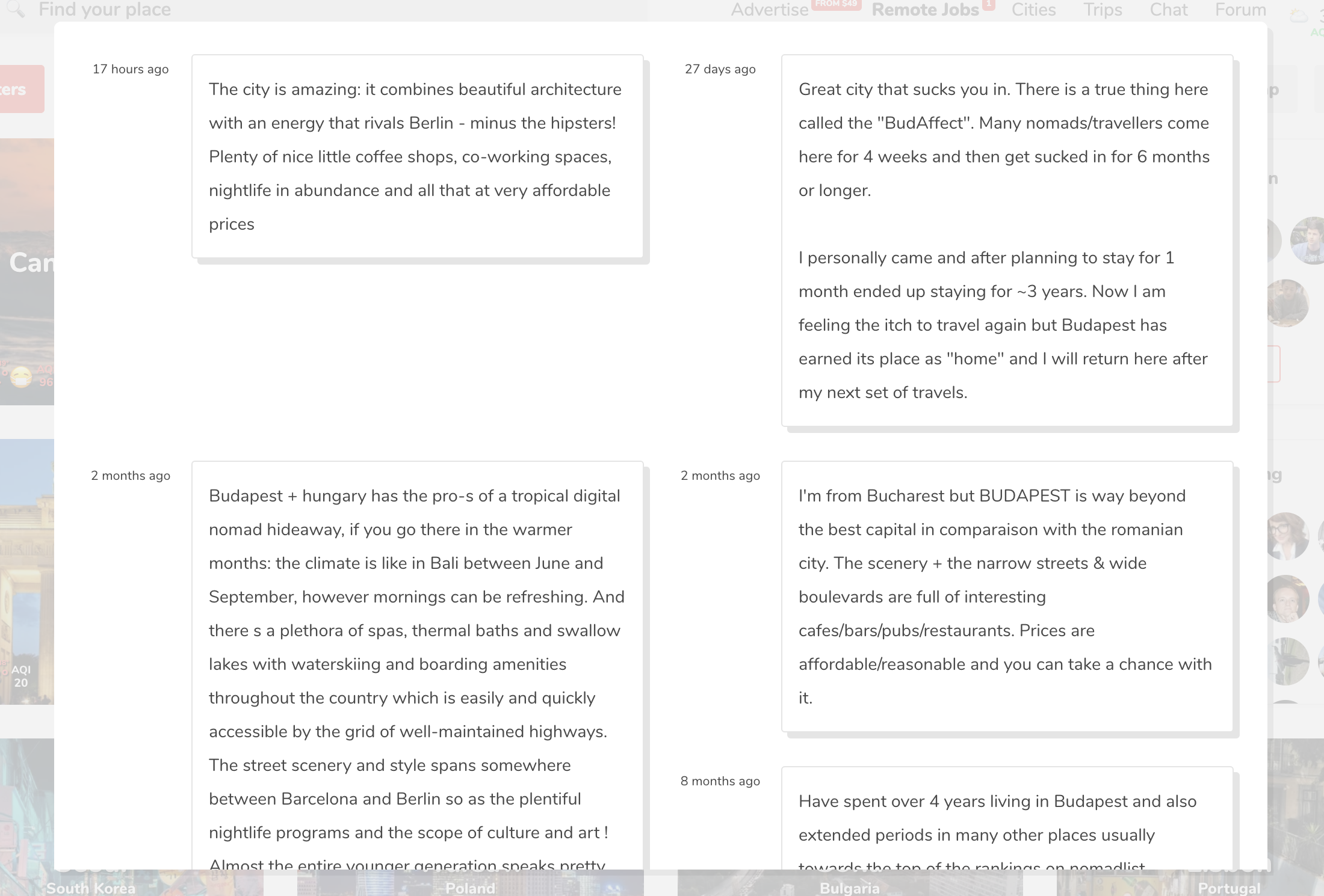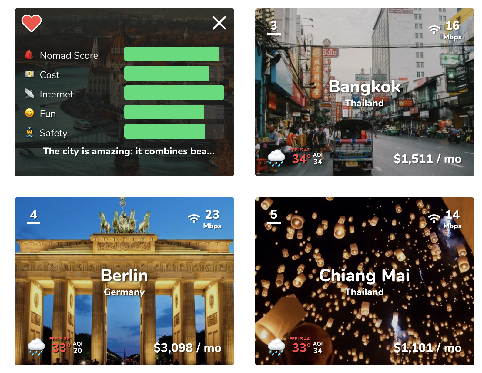 💬 After visiting cities people are now asked to review them. Reviews are fully anonymous, so this give you an honest perspective on the city. Pure data gives you only a limited idea of how a city can be, whereas someone writing about a city can give you a better picture.