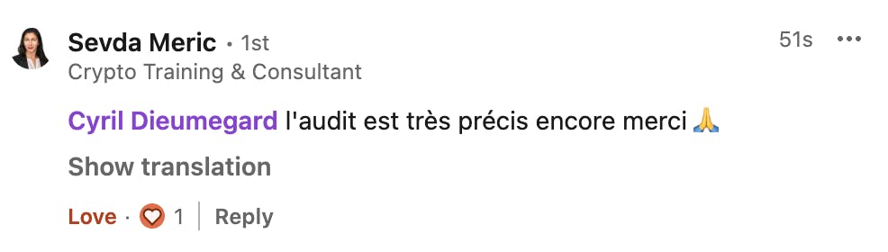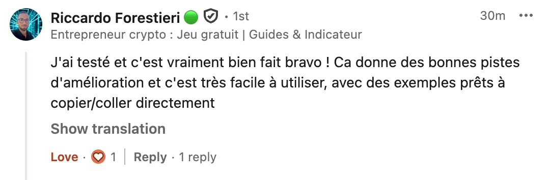 @cdieumegard thanks a lot for this easy to use and impacting tool ! Credit spent for free audit allowed me to clearly identify my profile's strenghts and weaknesses.