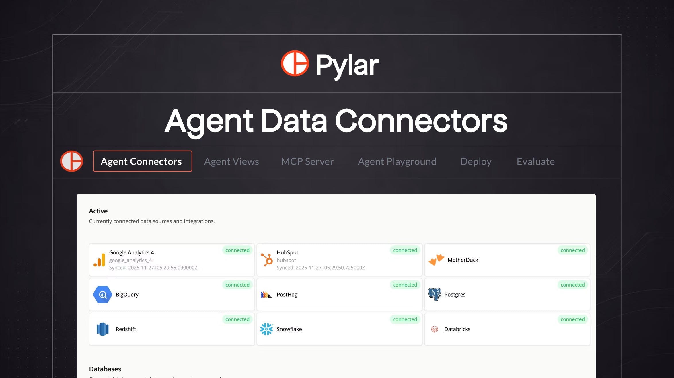 One of the biggest blockers to building agents is getting the data 'agent-ready'. Teams spend months building pipelines, wiring up sources, cleaning data, and centralizing it - before an agent can even ask its first question. Pylar now does this out of the box. We re source-agnostic. Whether your data lives across multiple databases and warehouses (Supabase, Snowflake, MySQL, etc.), you can connect one or many instantly, no re-architecture required. If you don't have a warehouse yet, we ve got you covered. Pylar ships with 100+ built-in integrations across marketing tools, CRMs, support platforms, product databases, and billing systems. Data comes in cleaned, transformed, and centralized, ready for agents to work with. Next up is agent views - once you've connected to your sources, you can write SQL across or within to create precise, sanitized, sandboxed views purpose built for specific agents. Agents don t roam your databases arbitrarily. You deterministically scope exactly what fields they can access, so they do their job well, without hallucinating or giving you different answers for the same/similar questions. Give it a try and let me know what you think!
