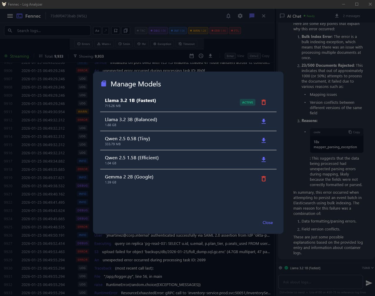 Fennec is a privacy-first, local log viewer with AI-assisted troubleshooting — built for teams that can’t send logs to the cloud.