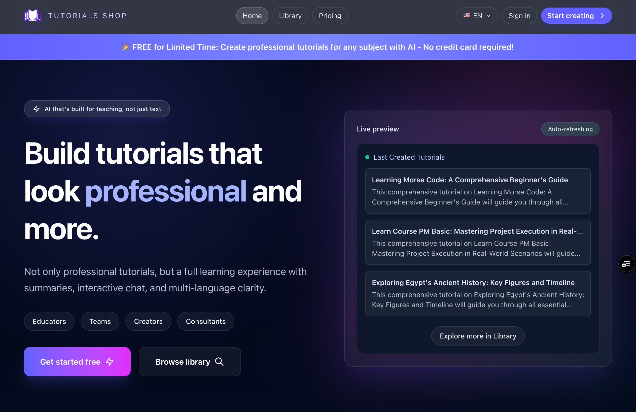 Create Tutorials in 4 Languages - Generate structured tutorials directly in EN/AR/FR/ES.