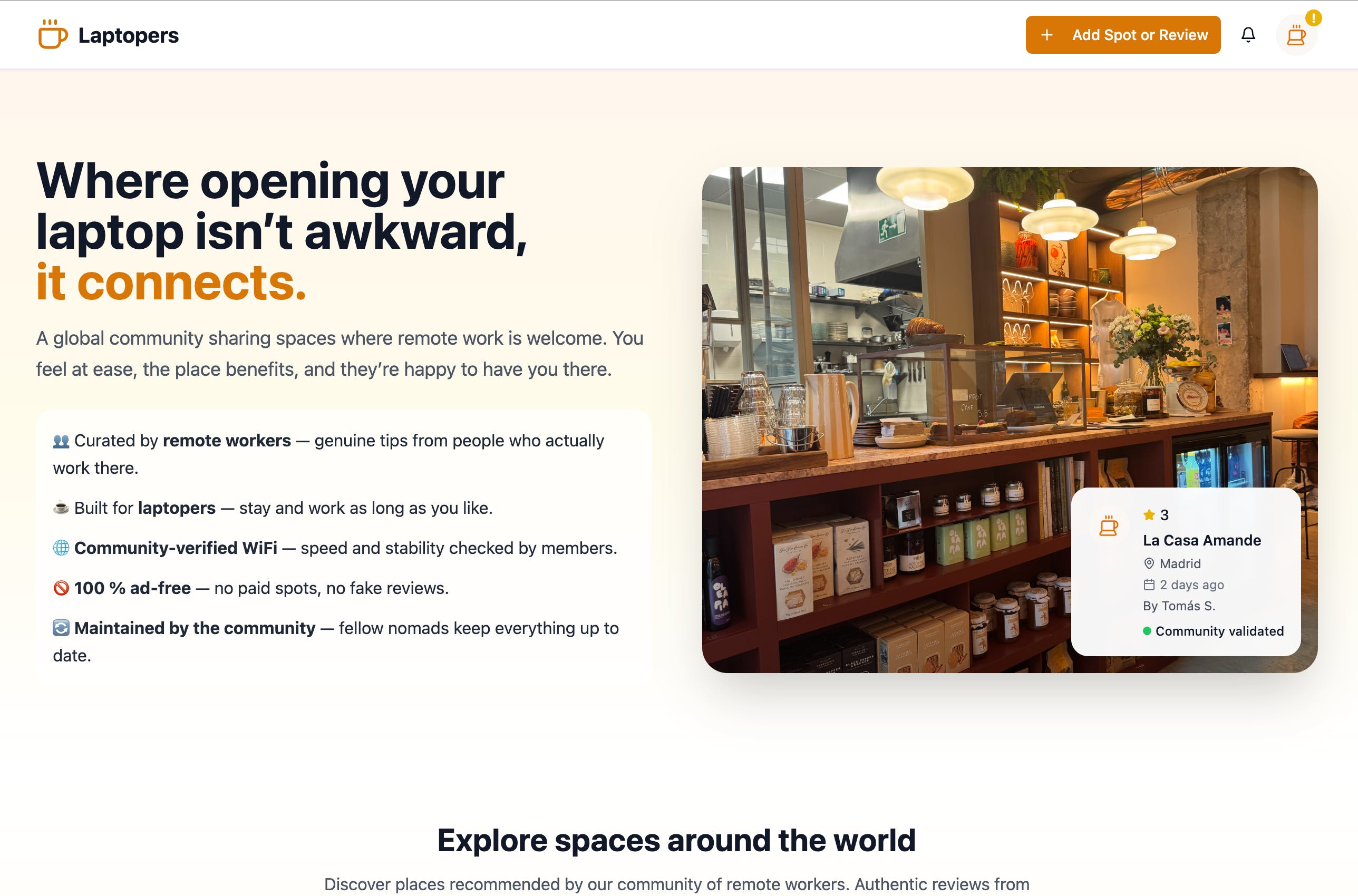 I built Laptopers because, as a remote worker, I was tired of feeling awkward just for opening my laptop at a café. Seeing the community’s early love has been incredible and really motivating.