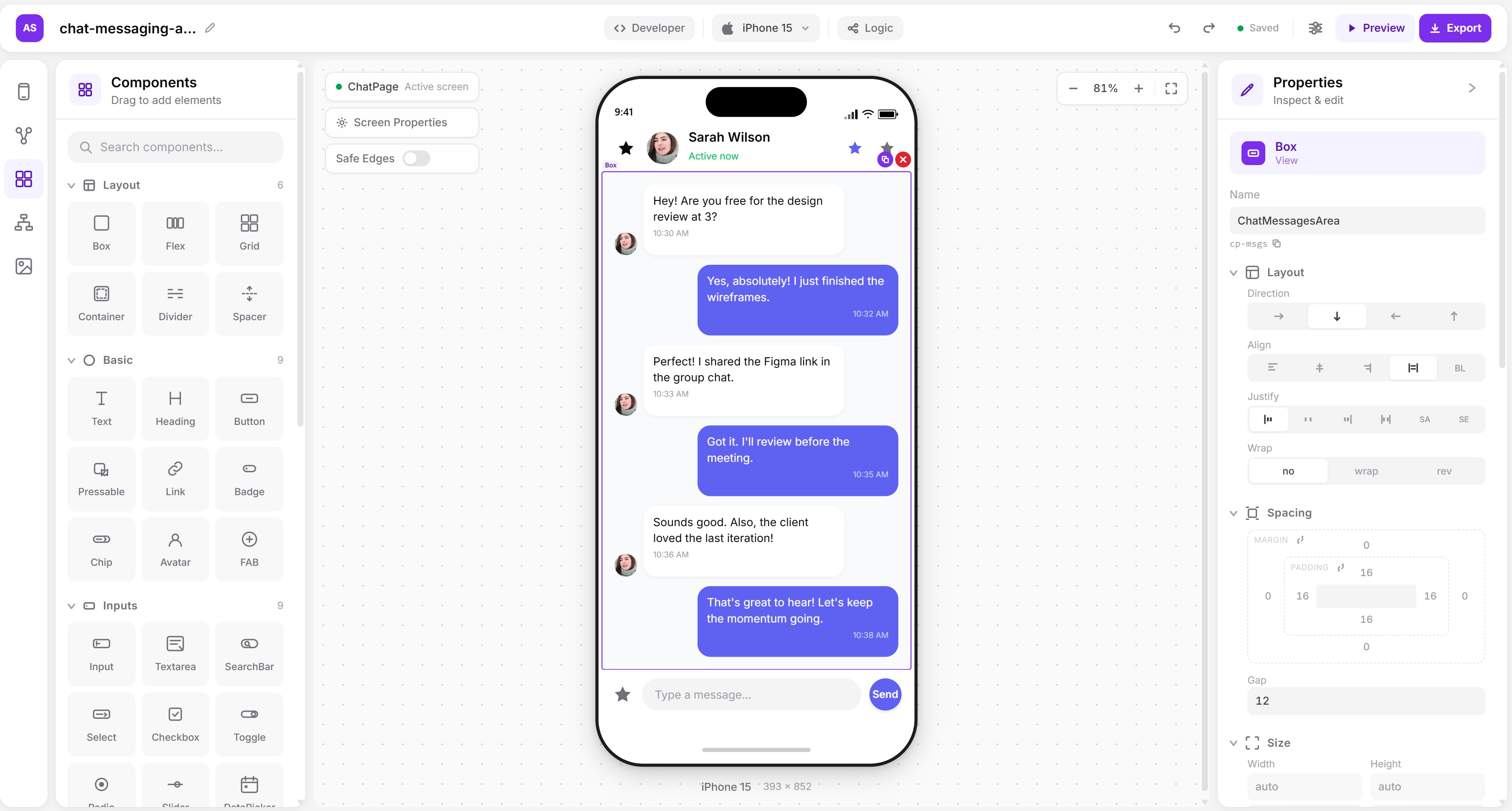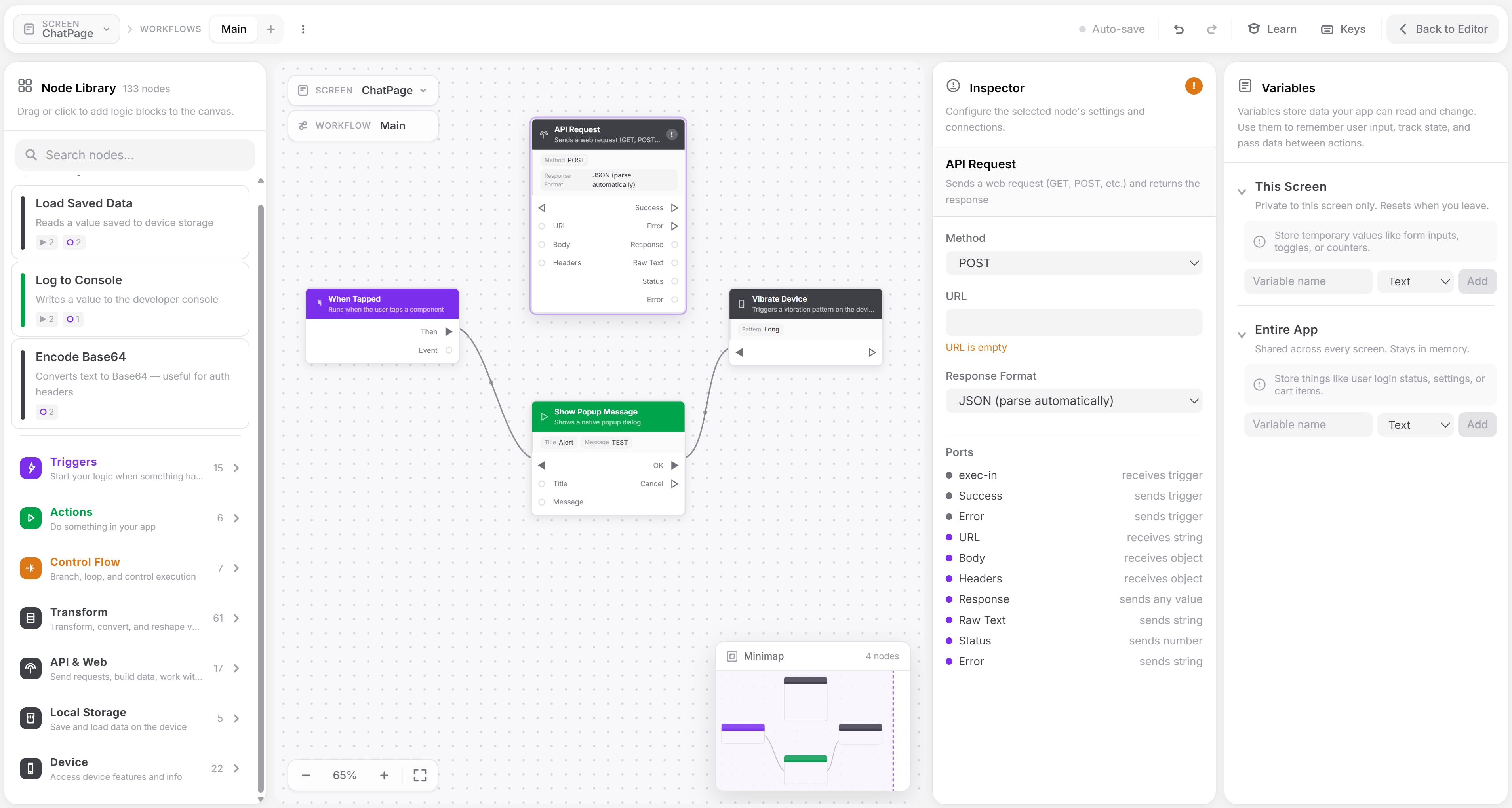 The platform lets you drag in pre built components: buttons, forms, lists, modals, navigation, maps, media players, whatever your app needs. Style them. Done. Then the real differentiator... the visual logic builder. You connect actions, conditions, API calls, data flows, all visually. No code. No scripts. No workarounds. Complex logic that would normally need a developer and you're building it by clicking and connecting blocks.