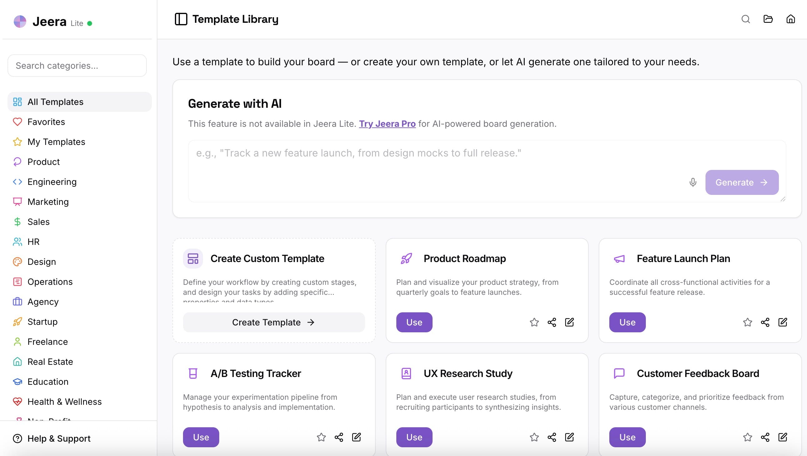 AI-powered task & template generation is available in Jeera Pro (not in Jeera Lite)