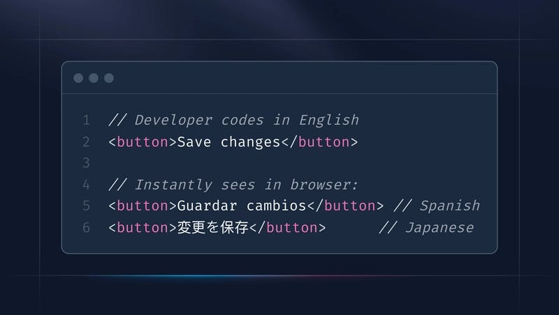Traditional i18n requires rewriting your entire codebase - extracting strings to JSON files, wrapping components in `<Translation />` tags, maintaining separate dictionaries.