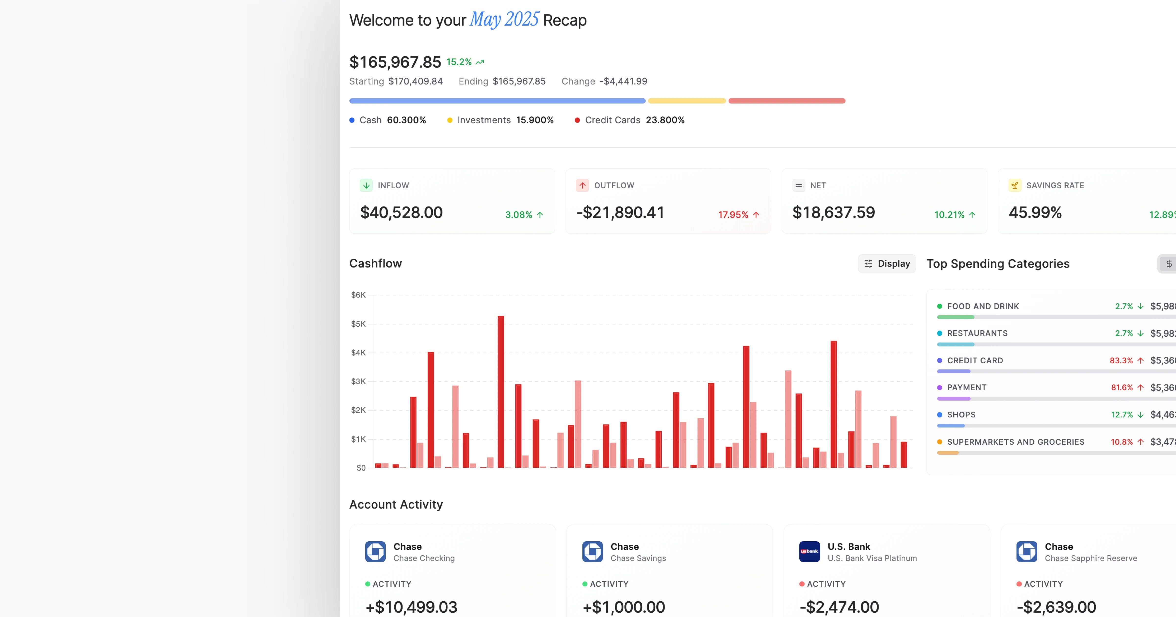 Get a complete picture of your financial health with automatically generated monthly summaries. Each recap includes your net worth progression, spending breakdowns, account activity, and transaction highlights — all in one comprehensive view.