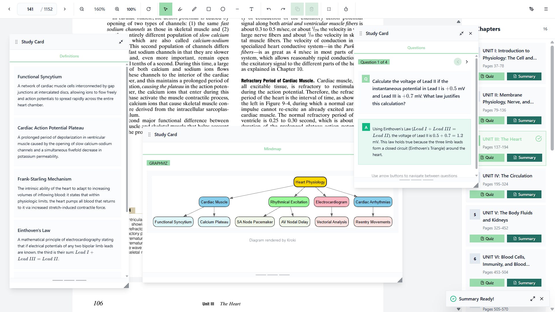 Studix is a chapter-aware PDF reader. It detects chapters automatically and keeps everything inside the document: inline explanations, floating definitions, mind maps, notes, summaries, and quizzes — all scoped to the chapter you’re reading.