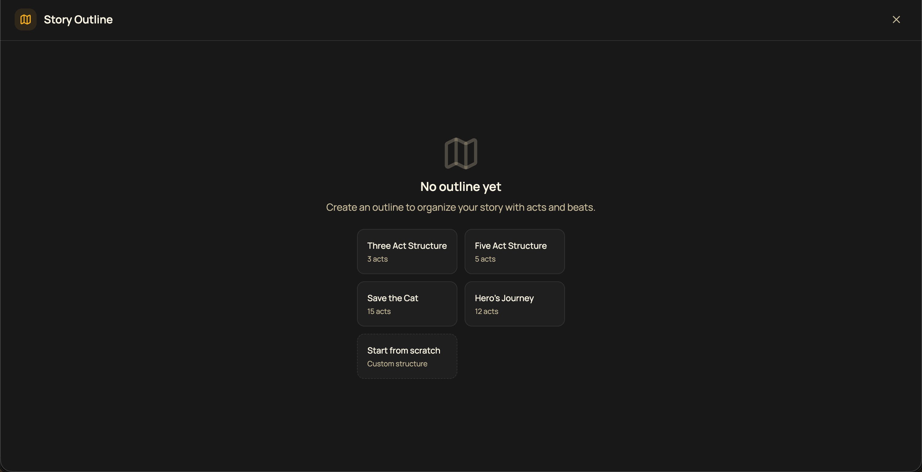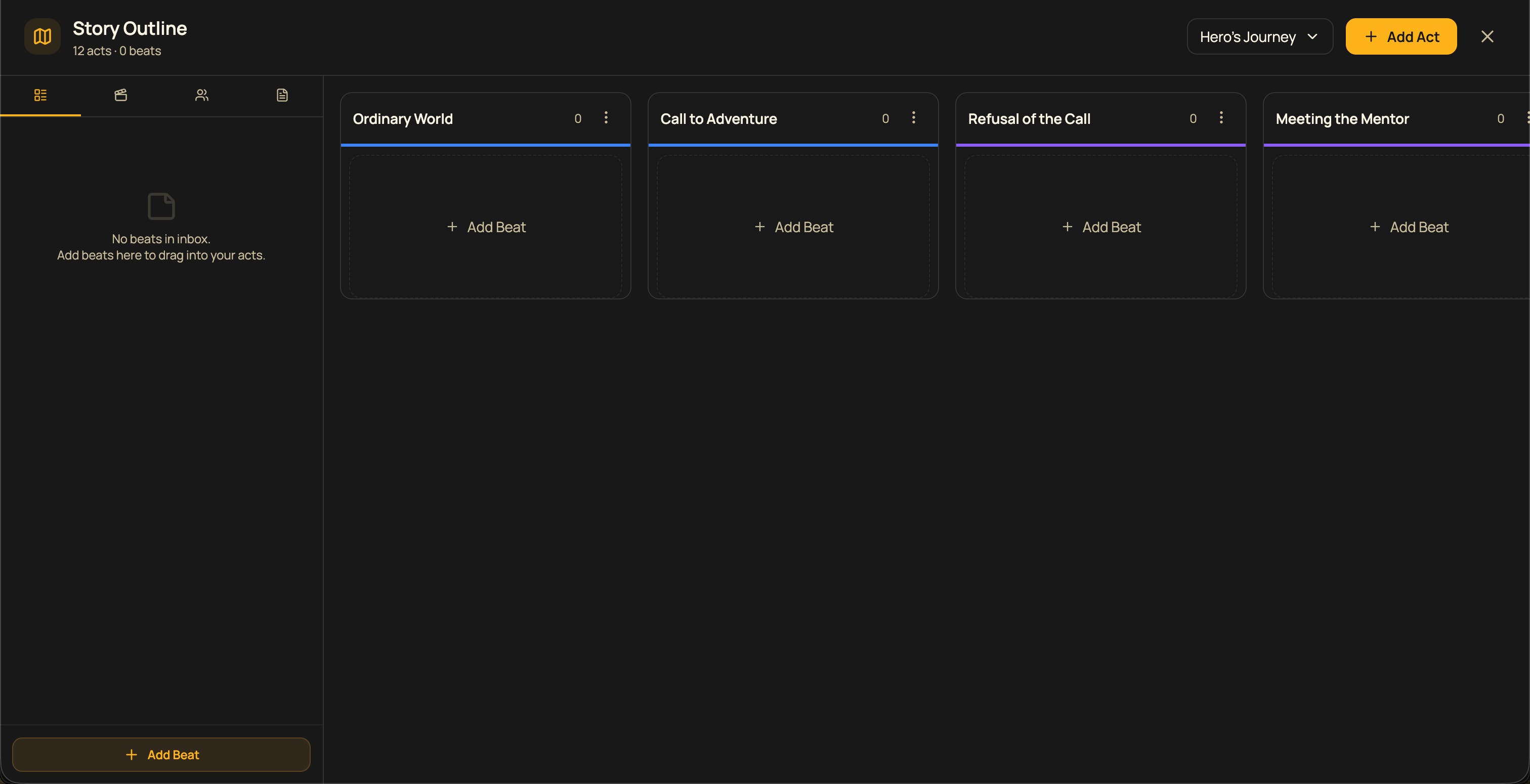 Story Outline & Acts: Map acts/beats/scenes, assign or unassign scenes to acts, cleaner drag/drop flows, and linked beats/logline/synopsis now feed AI suggestions.