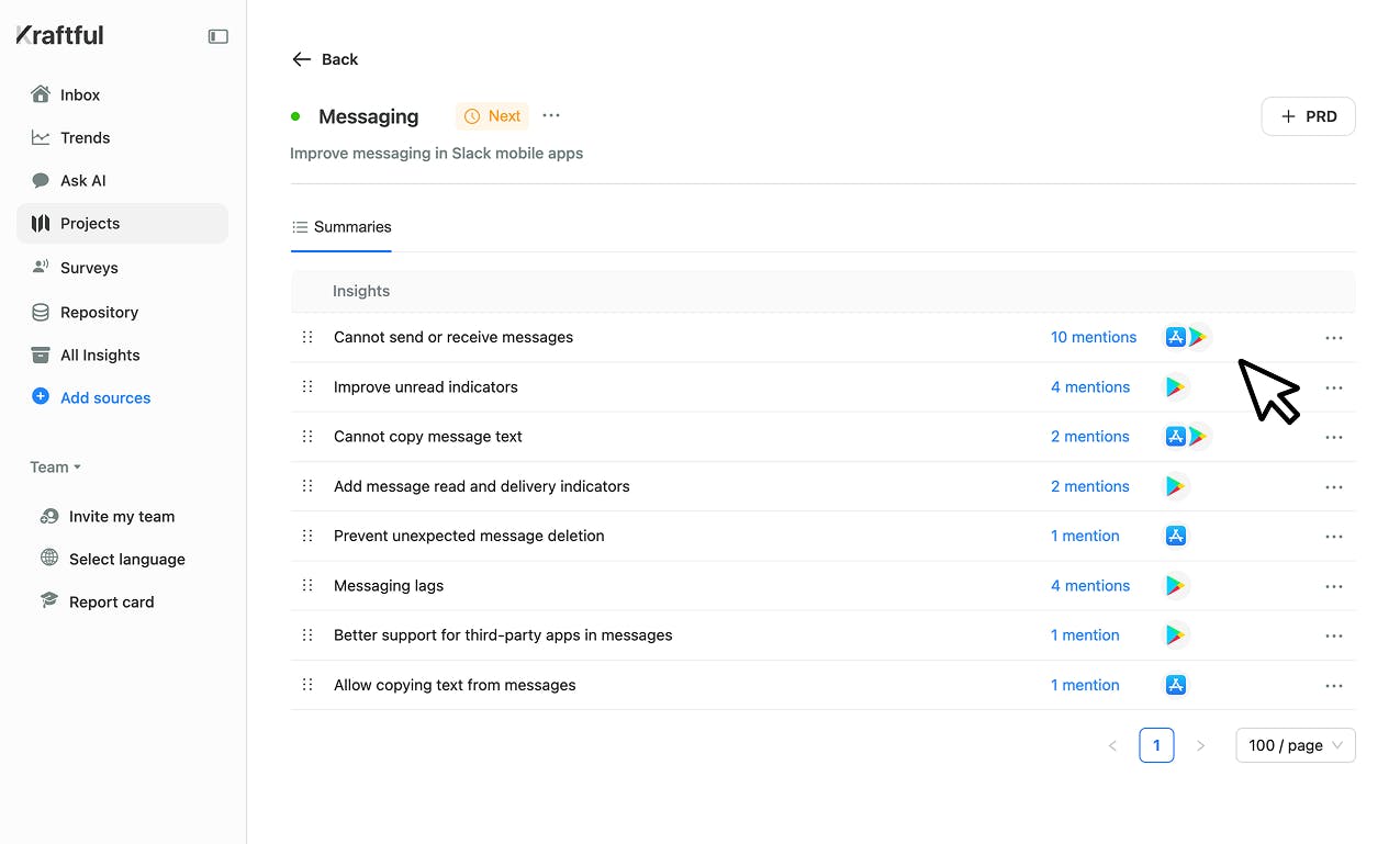 Turn insights into PRDs and user stories and sync to Jira or Linear