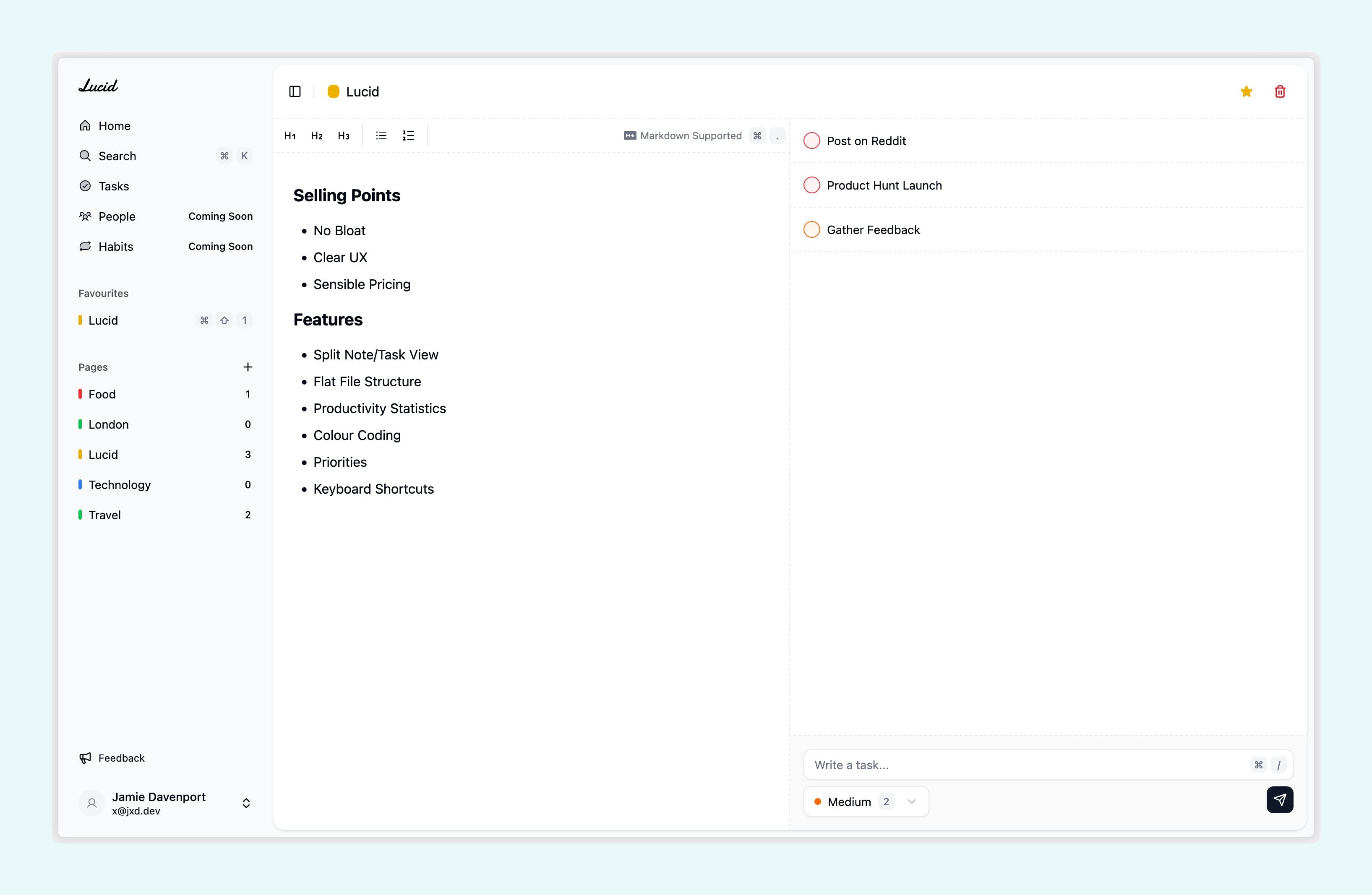 Clear split between notes and tasks.