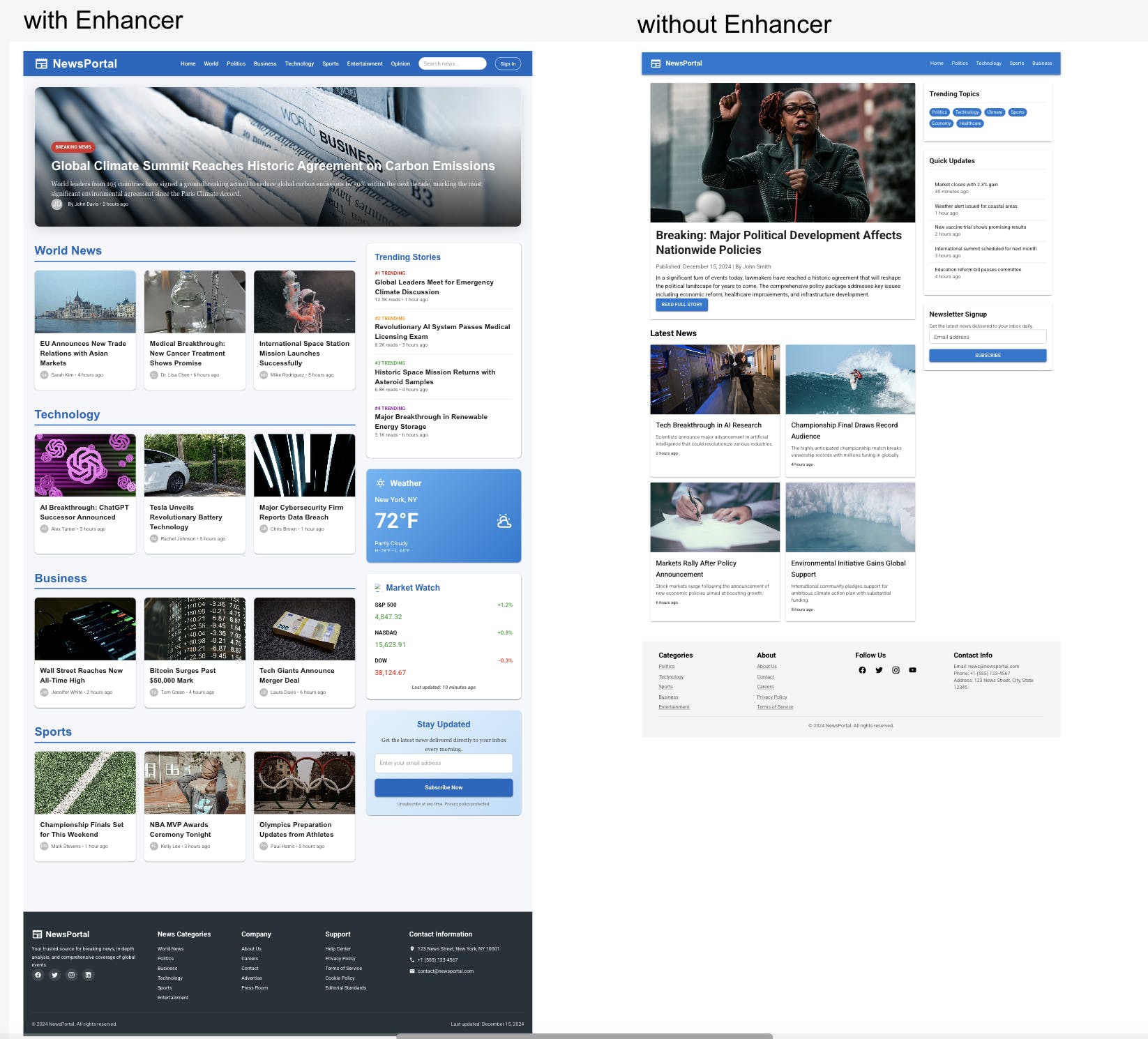 Create a comprehensive news portal website with a modern, professional design. Include a top navigation bar with logo, main menu sections (Home, World, Politics, Business, Technology, Sports, Entertainment, Opinion), search functionality, and user account options. Design a prominent hero section featuring the top breaking news story with a large image, headline, and brief excerpt. Below that, create a grid layout with multiple news categories: each section should have a category header and 3-4 article cards showing thumbnail images, headlines, publication time, and author names. Include a sidebar with trending stories, weather widget, stock market ticker, and newsletter signup form. Add a footer with links, social media icons, contact information, and newsletter subscription. Use a clean color scheme with blues and whites, readable typography (sans-serif headlines, serif body text), proper spacing, and ensure the design is fully responsive for desktop, tablet, and mobile devices. Include hover effects on article cards, smooth scrolling navigation, and accessibility features like proper contrast ratios and keyboard navigation support.