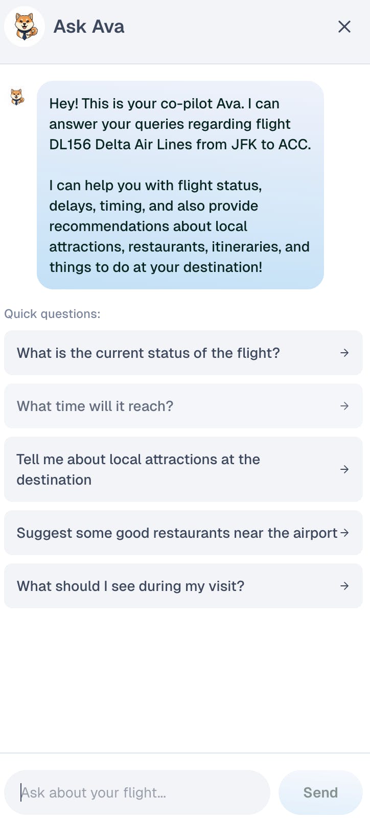 Ava knows your flight, your destination, and your vibe. Whether you’re tracking a loved one’s flight or preparing for your own, Ava brings real-time flight context together with local experiences — all in one chat.