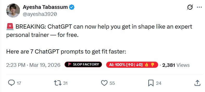 The current discourse surrounding "AI Slop" is stuck in a technical trap. We have been conditioned to ask a single, binary question: Is this AI-generated? But as the digital landscape shifts toward industrial-scale engagement farming, that question has become dangerously insufficient. As shown in Figure 1 (The Slop Taxonomy), the true nature of slop isn't defined by its production pipeline, but by its extraction mechanism. Whether a post is hammered out by an LLM in three seconds or obsessively A/B tested by a human marketer, the intent remains the same: audience capture for monetization. To fight back, we must move beyond the "AI score" and begin recognizing the structural hallmarks of the Slop Factory a coordinated system designed to treat your attention as a raw material for the machine.