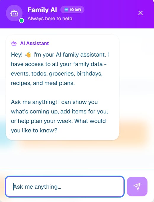 Keep your family connected & organized with real-time collaboration. Manage events, shared to-dos, smart grocery lists, and never miss a birthday. š¤ AI Meal Planning: Chat with AI for meal inspiration, auto-generate recipes, get step-by-step cooking mode with built-in timers, and instantly add ingredients to your shopping list. š Privacy-first with personal, shared, or custom visibility per item. 100% free forever. 2-minute setup. Made with ā¤ļø for families.