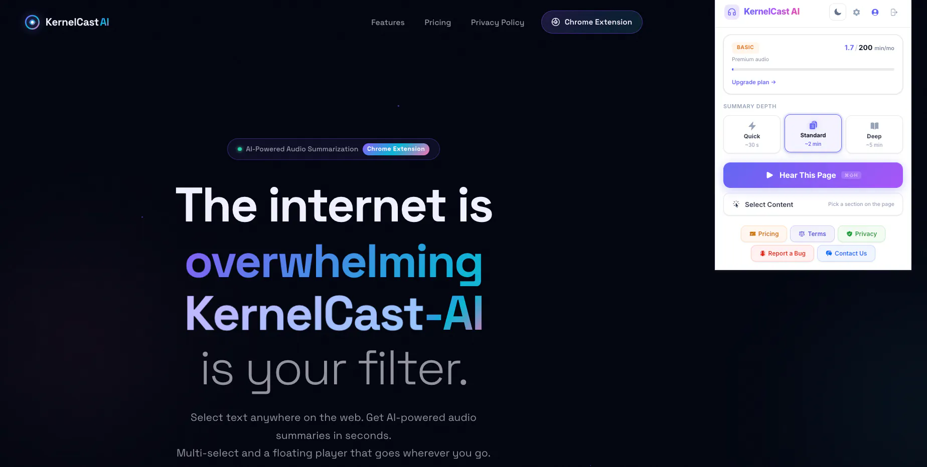 You have 40 tabs open. You'll read maybe two of them. KernelCast AI is a Chrome extension that summarizes any webpage and reads the key points to you in a natural voice. Click the icon, pick a summary depth, and listen while you keep working. Multi-select lets you highlight specific sections instead of summarizing the whole page. A floating audio player stays with you as you switch tabs. Summaries adapt to your interests so you always get what matters most. Start hearing what actually matters.