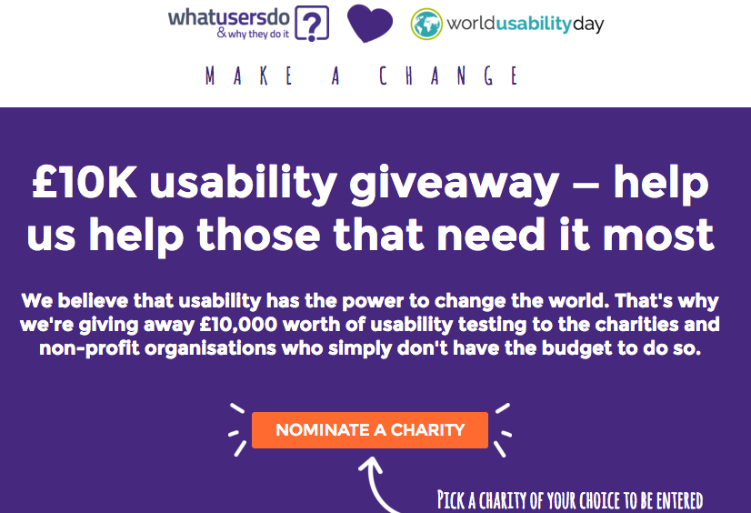[Introduction] We believe that usability has the power to change the world. That's why we're giving away £10,000 worth of usability testing to the charities and non-profit organisations who simply don't have the budget to do so. https://give.whatusersdo.com/mak...
