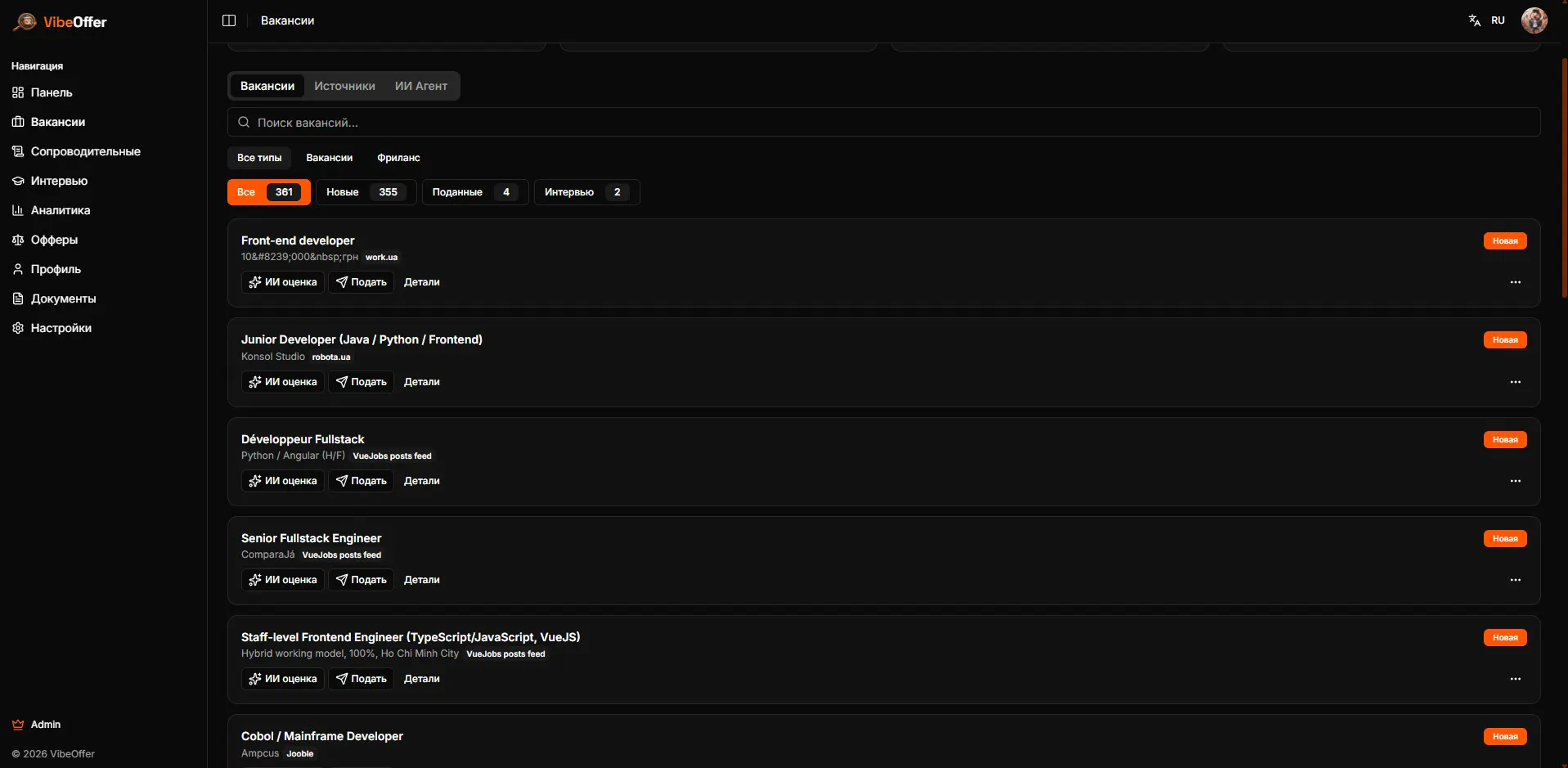 VibeOffer aggregates jobs from 28 sources — Djinni, DOU, LinkedIn, Telegram (62 channels), Work.ua, Upwork and more — and scores each vacancy 0–100 against your skills. Key features: → AI job scoring based on your profile → Cover letters for 10 platforms in 1 click → Interview pipeline tracker with STAR-method prep → HR competence analyzer → 9 PDF resume templates → Auto-apply agent Built by a solo dev while actively job hunting. Free plan available.